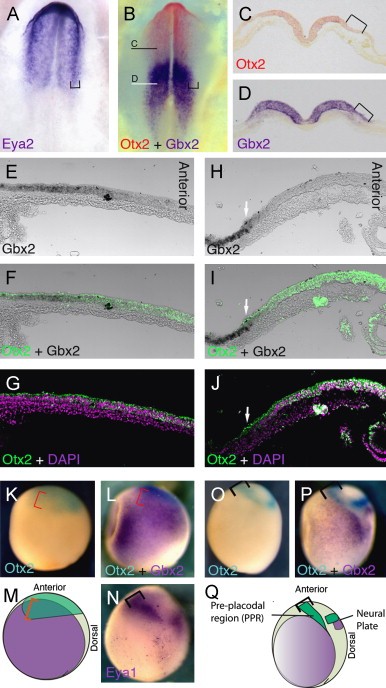 Fig. 1. Otx2 and Gbx2 form a boundary within the PPR. (A) Expression of Eya2 marks the PPR (bracket). (B)â(D) Double ISH for Otx2 (red) and Gbx2 (blue) at HH7. Lines indicate the level of sections shown in (C) and (D). (E)â(J) Parasagittal sections of stage HH5 (E)â(G) and HH7 (H)â(J) chick embryos after Gbx2 ISH (black (E), (F), (H), (I)) and Otx2 immunostaining (green; (F), (G), (I), (J)); DAPI labels nuclei ((G), (J); magenta). Arrows in (H)â(J) indicate anterior limit of Gbx2. (K) and (L) Double ISH in Xenopus for Otx2 ((K), (L); turquoise) and Gbx2 ((L); blue) at stage 12, dorsal to right anterior to the top. Red brackets indicate overlapping expression. (M) Diagram summarising expression of Otx2 and Gbx2 at stage 12 in Xenopus; red bracket: PPR. (N) Eya1 at stage 13 labels the PPR (bracket). (O) and (P) Double ISH for Otx2 ((O), (P); turquoise) and Gbx2 ((P); blue) at stage 13, dorsal to the right. Black brackets indicate the PPR. (Q) Diagram summarising neural plate and PPR expression of Otx2 and Gbx2 at stage 13 in Xenopus |