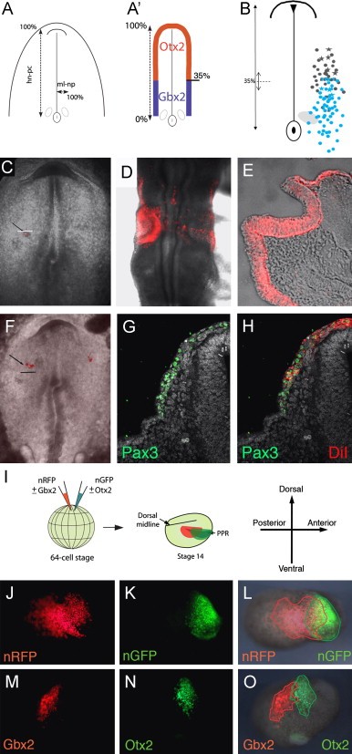 ig. 2. The Otx2/Gbx2 boundary separates otic and trigeminal precursors. (A) Diagram showing HH 7 stage chick embryo: the distance from the center of Hensen's node to the anterior tip of prechordal plate (hn-pc) and from the midline to the edge of the neural plate (ml-np) were set to 100%, respectively. The position of DiI label was measured and expressed as percentage of each distance. (Aâ²). The position of the Gbx2/Otx2 boundary was measured using the same landmarks. In total 9 embryos were measured with the boundary on average at 35±7%; most anterior position measured: 42%, most posterior position: 24.5%. (B) Diagram combining labels from this study and published fate maps ( [Streit, 2002] and [Xu et al., 2008]); gray: labels contributing to the trigeminal placode; blue: labels contributing to the otic placode. Circles: labels from published fate maps; squares: labels with dual fate from the current study; stars: labels from the current study. 35% indicates the average position of the Otx2/Gbx2 boundary (dotted line)±standard deviation (small arrow); note: mixed trigeminal and otic fates mostly locate near this boundary. (C) HH7 embryo with DiI labeled cells posterior to the average position of the Otx2/Gbx2 boundary (white line). (D) and (E) At HH12 their descendants contribute to the otic placode as shown in whole mount (D) and in transverse sections (E) and (F). HH7 embryo with DiI label anterior to the average position of the Otx2/Gbx2 boundary (black line). (G) and (H) At HH11 their descendants overlap with Pax3 protein (green) in the trigeminal placode. In total, 21 labels were placed into the Otx2+ and 12 into the Gbx2+ domain. (I) Diagram showing the experimental design: blastomeres were injected at the 64-cell stage in Xenopus and their position scored at stage 14. Arrows show the orientation of all embryos. (J)â(L) Neighboring blastomeres were injected with nGFP and nRFP and grown until stage 14. Descendants from injected cells are intermingled as indicated by red and green outlines in L (100%, n=10). (M)â(O) When injected with nGFP/Otx2 and nRFP/Gbx2 descendants from adjacent blastomeres do not mix (boundary in 79% of embryos, n=14). Red and green outlines in O show the distribution of cells. |