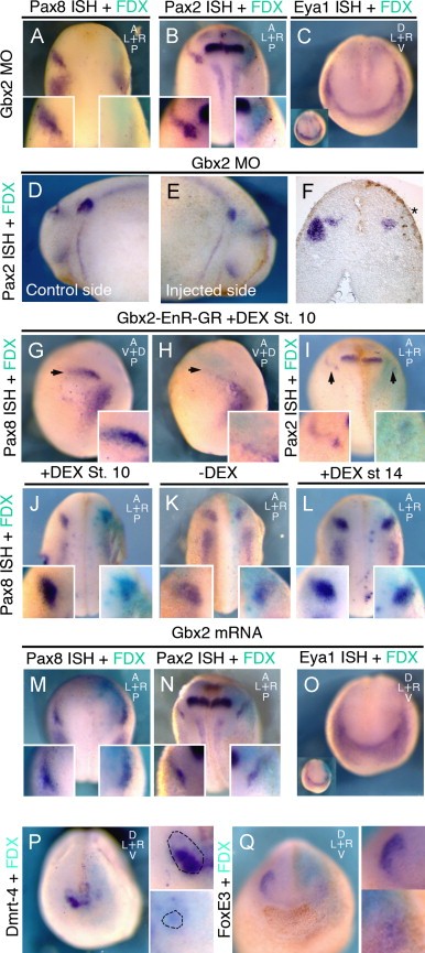 Fig. 4. Gbx2 is required for otic specification. (A)â(C) Injection of splice and translation blocking Gbx2 morpholinos inhibits otic Pax8 (A; 54%, n=28) and otic Pax2 ((B); 55%, n=131; Splice MO: 66% affected, n=29; ATG MO: 49% affected, n=79). There is no effect on Eya1 (0% affected, n=30. (C): blue). (D)â(F) At stage 25, Pax2 expression is reduced and the otic vesicle is small (asterisk in transverse section F) after injection of splice and translation blocking Gbx2 morpholinos ((E) 59% affected, n=66; splice MO: 44% affected, n=25) when compared to the uninjected side (D). (G)â(I) Injection of inducible Gbx2-EnR-GR: activation at stage 10 reduces otic Pax8 (arrow) at stage 13 ((H); 49%, n=43) compared to uninjected side (G) and Pax2 at stage 16 ((I); arrow; 46% n=18). (J)â(L) Activation of inducible Gbx2-EnR-GR at stage 10 (J) reduces Pax8; no change is observed in absence of DEX ((K); 0% affected, n=17) or when DEX is added at stage 14 ((L) 0% affected, n=110). (M)â(O) Gbx2 mRNA does not expand Pax8 ((M); 0% affected, n=35), Pax2 ((N); 0% affected, n=22), and Eya1 ((O) 0% affected, n=22). (P), (Q) Overexpression of Gbx2 reduces Dmrt-4 ((P) 66%, n=29) and FoxE3 ((Q) 92%, n=13). Small panels in (P) and (Q) show higher magnification of the control (top) and injected (bottom) side. All embryos were injected into the A3 blastomere at the 32-cell stage; inserts in (A), (B), (G)â(N) high magnification of the otic region. In (C) and (O) turquoise staining reveals FDX. Crosses indicate the orientation of embryos; a: anterior, l: left, p: posterior, r: right, d: dorsal, v: ventral. |