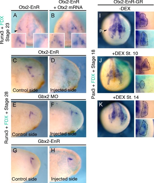Fig. 5. Activation of Otx2 target genes is required for trigeminal placode specification. (A), (B) Otx2-EnR inhibits Runx3 at stage 23 ((A); 59%, n=26; arrowhead: trigeminal placode on uninjected side). This is rescued by co-injection of Otx2 ((B) inhibition reduced to 17%, n=36). Inserts show higher magnification of the trigeminal region. (C), (D) At stage 28 the profundal and trigeminal placodes can be distinguished; both are reduced after Otx2-EnR injection (78%, n=18). Compare control (C) and injected side (D). (E), (F) Injection of Gbx2 splice and translation blocking morpholinos ((F) 0% affected, n=25) does not affect Runx3; compare uninjected (E) and injected side (F). (G), (H). Injection of Gbx2-EnR does not affect Runx3 ((H); 3% affected, n=31); compare control (G) and injected side (H). (I)â(K) Activation of Otx2-EnR-GR at stage 10 inhibits Pax3 the profundal placode ((J) 49%, n=33); no change is observed without DEX ((I) 5% affected, n=61; PR: profundal placode) or when added at stage 14 ((K) 5% affected, n=42). Magnifications show profundal region (dotted outline) on the uninjected (top) and injected side (bottom; FDX: turquoise). All embryos were injected into the A3 blastomere at the 32-cell stage. |