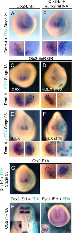 Fig. 7. Activation of Otx2 target genes is required at early and late stages of olfactory placode formation. (A), (B) Otx2-EnR inhibits the olfactory placode marker Dmrt4 at stage 21 (59%, n=29). This is rescued by co-injection of Otx2 ((B) inhibition reduced to 12%, n=33). (CâF) Otx2-EnR-GR injections: in the absence of DEX Dmrt4 expression is normal ((C) 5% affected, n=20); when DEX is added at stage 10 Dmrt4 expression is lost at stage 18 ((D) 59%, n=44). At stage 25 Dmrt4 is normal in absence of DEX ((E) 8% affected, n=26), while activation at stage 18 strongly reduces Dmrt4 ((F); 63%, n=24). (G) Otx2-E1A has no effect on Dmrt4 (0% affected, n=14). (H)â(I) Otx2 mRNA reduces Pax2 ((H) 72%, n=25), but does not change Eya1 ((I) 0% affected, n=44). All embryos were injected into the A3 blastomere at the 32-cell stage and are shown in frontal view with dorsal to the top. High magnifications of the olfactory region are shown in small panels; dotted lines demarcate placodal Dmrt4. Turquoise staining reveals the lineage tracer FDX. |