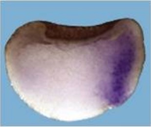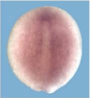 trabd2a (TraB domain containing 2A)gene expression in Xenopus laevis embryo, assayed via in situ hybridization, NF stage 10.5, vegetal/blastoporal view, dorsal up. |