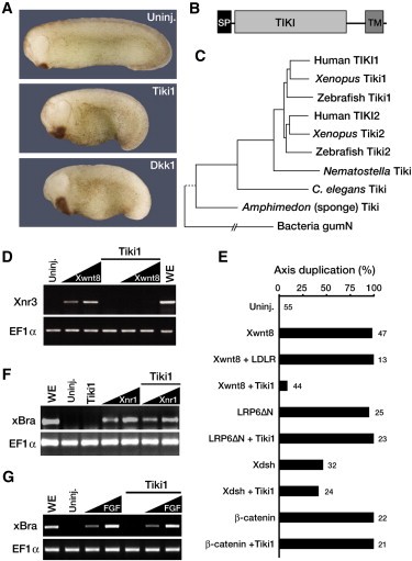 Figure 1. Tiki1 Promotes Anterior Development and Inhibits Wnt Signaling(A) Dorsal injection of Tiki1 mRNA (100 pg) induced enlarged head similar to that induced by Dkk1.(B) Tiki1 domain scheme. SP, signal peptide; TM, transmembrane.(C) Phylogenetic tree of Tiki proteins from human, Xenopus, zebrafish, Nematostella, C. elegans, and Amphimedon by ClustalW (see Figure S1). TIKI domain is homologous to bacterial gumN (see Figure S2A).(D) Tiki1 inhibited Xwnt8-induced Xnr3 expression in animal caps. EF-1 alpha: a loading control; uninj: uninjected embryos; WE: whole embryos.(E) Tiki1 inhibited axis duplication by Xwnt8 but not by LRP6-delta-N, Xdsh, or beta-catenin. LDLR: a control. Numbers indicate embryos scored.(F and G) Tiki1 did not inhibit Nodal or FGF signaling.See also Figures S1 and S2. |