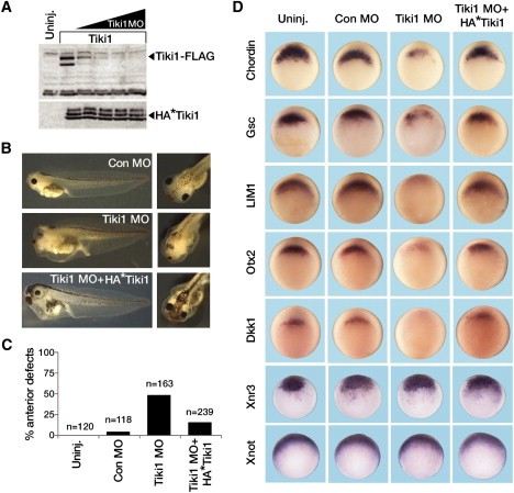 Figure 3. Tiki1 Is Required for Anterior Development(A) Tiki1MO (5, 10, 20, and 40 ng) inhibited protein expression from Tiki1-FLAG but not HAâTiki1 mRNAs (500 pg).(B) Tiki1MO (20 ng) caused anterior defects, which were rescued by HAâTiki1 mRNA (50 pg). Lateral (left) and dorso-anterior (right) views are shown at stage 42.(C) Statistical data of the Tiki1MO phenotype.(D) Tiki1MO suppressed head organizer gene expression at stages 10.5â11. See also Figure S3 and Tables S1, S2, and S3. |