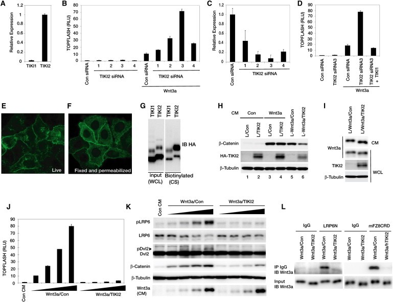 Figure 4. Tiki Inactivates Wnt3a(A) Relative expression levels of TIKI1 and TIKI2 mRNAs in HEK293T cells.(B) Knocking down endogenous TIKI2 in HEK293T cells enhanced Wnt3a signaling.(C) TIKI2 mRNA knockdown examined 48 hr after siRNA transfection.(D) The TIKI2 knockdown effect was countered by TIKI1 expression.(E and F) Immunofluorescence of HAâTiki1 expressed in HeLa cells. Live cells (E) or fixed-permeabilized cells (F) were labeled by an anti-HA antibody and a fluorescent secondary antibody.(G) HeLa cells expressing HA-TIKI1 or HA-TIKI2 were treated with a nonpermeable biotinylation reagent. Cell surface (CS) proteins were precipitated with streptavidin beads and blotted for HA-TIKI1/2. WCL: input whole-cell lysates. The slower-migrating form of HA-TIKI, due possibly to glycosylation, was enriched on the cell surface.(H) TIKI2 inhibited β-catenin stabilization in Wnt3a-expressing cells. Indicated L cell lines were also treated with control or Wnt3a CM for 2 hr (lanes 1â4). β-tubulin: a loading control.(I) Wnt3a was secreted similarly with or without TIKI2 but exhibited faster migration due to TIKI2.(J) Wnt3a CM from TIKI2-expressing L cells exhibited minimal activity, tested at concentrations in 2-fold dilutions.(K) Wnt3a CM from TIKI2-expressing L cells induced minimal LRP6 or Dvl2 phosphorylation or β-catenin stabilization at 2 hr. LRP6 intensity reduction was not due to decreased protein levels but due to LRP6 phosphorylation, which perturbed recognition by the LRP6 antibody used (not shown).(L) Wnt3a secreted from TIKI2-expressing cells exhibited minimal binding to mFz8CRD-IgG or LRP6N-IgG (Tamai et al., 2000).All error bars represent standard deviation (SD) in triplicates. See also Figure S4. |
