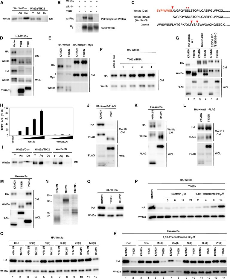 Figure 5. Tiki Inactivates Wnt3a via Amino-Terminal Cleavage(A) Triton X-114 phase separation. Control Wnt3a partitioned in detergent (De), but Wnt3a from TIKI2-expressing cells partitioned in aqueous (Aq) phase. T, total.(B) TIKI2 did not affect Wnt3a acylation (C77 plus S209) in metabolic labeling.(C) Amino-terminal cleavage of Wnt3a and Xwnt8 by TIKI2. The big and small arrowheads indicate major and minor cleavage sites, respectively (see Figure S5). Wnt3aδN was engineered to be identical to TIKI-cleaved Wnt3a.(D) TIKI cleaved the HA tag from HA-Wnt3a. TIKI1 cDNA was transfected at a 10-fold higher dose than that of TIKI2 for similar protein levels.(E) TIKI did not cleave Rspo1. ânonspecific.(F) Endogenous TIKI2 cleaved Wnt3a in HEK293T cells. TIKI2 siRNAs were as in Figures 4B and 4C.(G) Wnt3a(S25D/L26D) and Wnt3a(S25D/L26D/S33D/S34D) were partially and fully resistant to TIKI2N cleavage, respectively (lanes 4 and 6 versus 2). Both mutants exhibited slower mobility.(H) Wnt3aδN was inactive as examined by cDNA transfection in 2-fold dilutions. Error bars represent SD in triplicates.(I) Wnt3aδN in CM partitioned in the aqueous phase.(JâL) TIKI2 cleaved the HA tag from HA-Xwnt8-FLAG and HA-Wnt5a but not HA-Xwnt11-FLAG. Levels of KRM2N and TIKI2N (both FLAG-tagged) were monitored.(M) HA-Wnt3a was cleaved by TIKI2N, but not by KRM2N or TIKI2Nδ (FLAG-tagged), in HEK293T cells.(N) Silver staining of purified KRM2N, TIKI2N, or TIKI2Nδ.(O) Purified TIKI2N, but neither KRM2N nor TIKI2Nδ, cleaved recombinant HA-Wnt3a in vitro.(P) TIKI2N cleavage of HA-Wnt3a was inhibited by 1, 10-Phenanthroline but not Bestatin. Sixteen micromoles of 1, 10-Phenanthroline is about 100 times lower than manufacturer's recommended doses.(Q) TIKI2N cleavage of HA-Wnt3a was enhanced by Co2+ or Mn2+ but inhibited by Ni2+, Cu2+, or Zn2+.(R) TIKI2N inhibition by 1, 10-Phenanthroline was rescued by Co2+ or Mn2+ (lanes 6 and 8).See also Figures S4, S5, S6, and S7 and Table S4. |