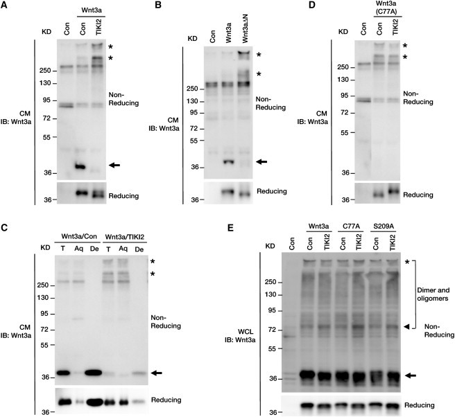 Figure 6. Wnt3a Oxidation-Oligomerization due to Tiki Cleavage(AâD) Secreted Wnt3a in CM. The arrow and â indicate Wnt3a monomers and oligomers in nonreducing gels, respectively (top). Note the enormous size of the upper â band. Reducing gels (bottom) were also shown.(A) Wnt3a from TIKI2-expressing cells formed oxidized oligomers exclusively.(B) Wnt3aδN formed oxidized oligomers.(C) Oxidized Wnt3a oligomers partitioned exclusively in the aqueous phase, whereas Wnt3a monomers partitioned in detergent.(D) Wnt3a(C77A) formed oxidized oligomers regardless of TIKI2. This experiment was performed together with the one presented in (A), and a common control lane was used. Secreted Wnt3a(C77A) after TIKI2 cleavage migrated slower in the reducing gel due to altered N-glycosylation (see Figure S4E).(E) Wnt3a, Wnt3a(C77A), and Wnt3a(S209A) behaved similarly in whole-cell lysates. Each existed as monomers (arrow) and heterogeneous oxidized species from dimers (arrowhead) to larger oligomers (â), regardless of TIKI2 cleavage.See also Figures S6 and S7. |
