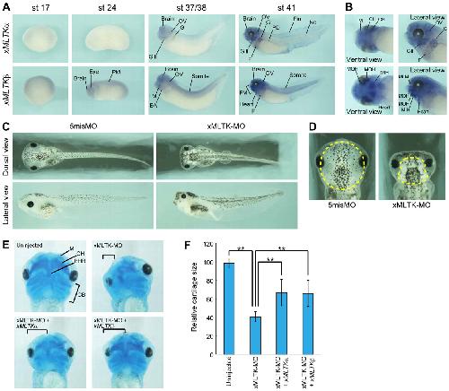Fig. 1. xMLTK is required for craniofacial cartilage formation. (A) Whole-mount in situ hybridization for xMLTKα and xMLTKβ was performed on embryos at stages 17, 24, 37/38 and 41. OV, otic vesicle; G, glomus; PD, pronephric duct; No, notochord; F, left-rostral furrow in yolk mass; PM, paraxial mesoderm; FM, facial muscle; BA, branchial arch. (B) Magnified view of embryos at stage 41 shown in A. M, Meckelâs cartilage; CH, ceratohyal cartilage; CB, ceratobranchial cartilage; OV, otic vesicle; G, glomus; F, left-rostral furrow in yolk mass; MQH, m. quadrato-hyoangularis; MOH, m. orbitohyoideus; MIH, m. interhyoideus; MLM, m. levator mandibulae. (C) xMLTK-MO or 5misMO was injected into the animal pole of all blastomeres (10 ng/cell) at the four-cell stage, and the embryos were fixed at stage 45. (D) Magnified view of the head of the embryo shown in C. Craniofacial cartilage is outlined with a dashed yellow line. (E) xMLTK-MO (n=29), xMLTK-MO plus xMLTKα-res-myc plasmid (n=25), or xMLTK-MO plus xMLTKβ-res-myc plasmid (n=25) was injected unilaterally into the animal pole of two blastomeres (xMLTK-MO, 10 ng/cell; plasmid, 50 pg /cell) at the four-cell stage. Uninjected embryos (n=31) and injected embryos were fixed at stage 45, and cartilages were stained with Alcian Blue. Brackets indicate the injected side. M, Meckelâs cartilage; CH, ceratohyal cartilage; CB, ceratobranchial cartilage; BHB, basihyobranchial cartilage. (F) The relative cartilage size (the rate of the length of the right side to that of the left side of ceratohyal cartilages) was quantified. Values are mean±s.d. **P<0.01. |