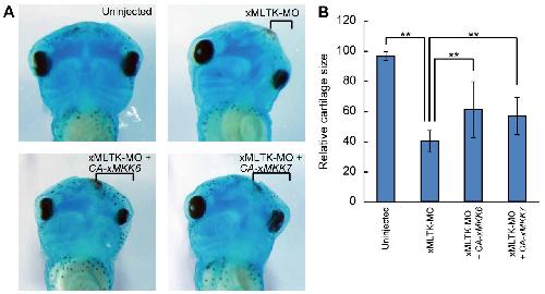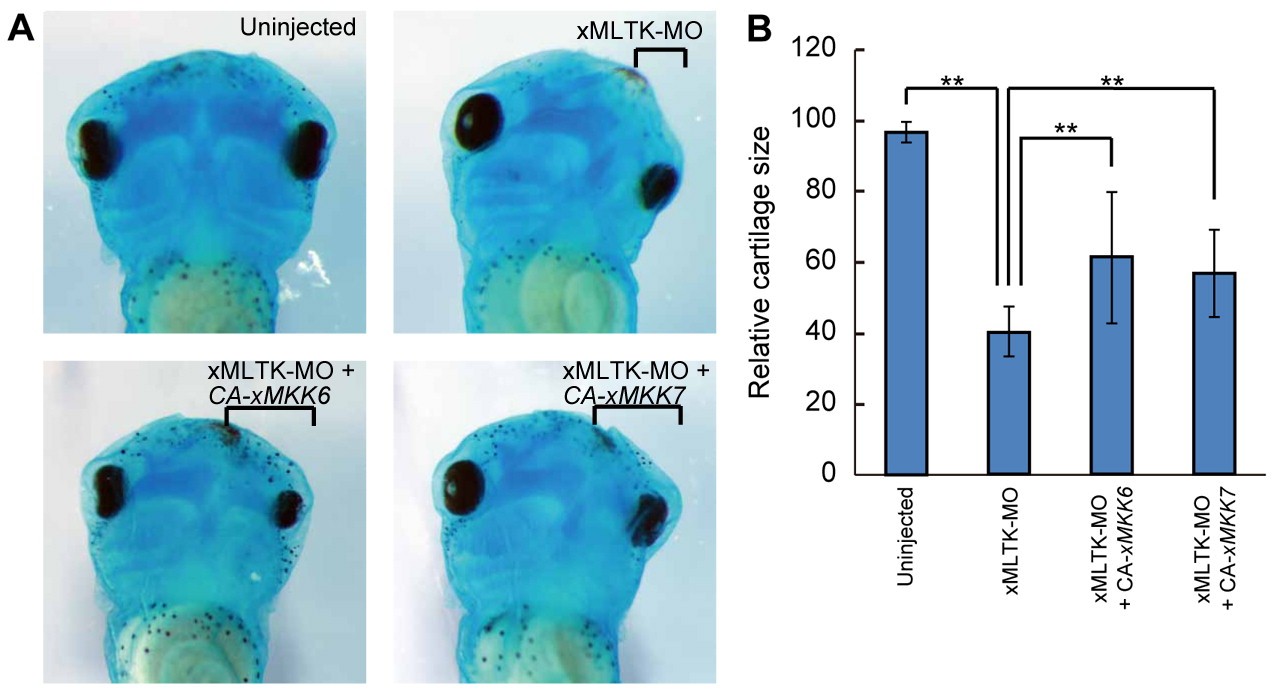 Fig. 7. p38 and JNK pathways function downstream of xMLTK during chondrogenesis. (A) xMLTK-MO (n=33), xMLTK-MO plus HA-CA-xMKK6 plasmid (n=29) or xMLTK-MO plus HA-CA-xMKK7 plasmid (n=33) was injected unilaterally into the animal pole of two blastomeres (xMLTK-MO, 10 ng/cell; plasmid, 50 pg /cell) at the four-cell stage. Uninjected embryos (n=38) and injected embryos were fixed at stage 45, and cartilages were stained with Alcian Blue. Brackets indicate the injected side. (B) The relative cartilage size (the rate of the length of the right side to that of the left side of ceratohyal cartilages) was quantified. Values are means±s.d. **P<0.01. |