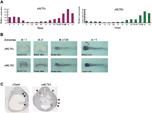 Fig. S2. The temporal and spatial expression patterns of xMLTKα and xMLTKβ. (A) Temporal expression patterns of xMLTKα and xMLTKβ during embryonic development were analyzed by qRT-PCR using isoform-specific primers. (B) Dorsal view of embryos shown in Fig. 1A. OV, otic vesicle. (C) Histological sections from embryos at stage 22 and 24 stained by whole-mount in situ hybridization for xTwist and xMLTKβ, respectively. Arrowheads indicate the regions expressing high levels of xTwist (left, neural crest) and xMLTKβ (right, epidermis), respectively. |