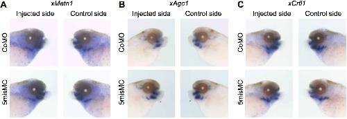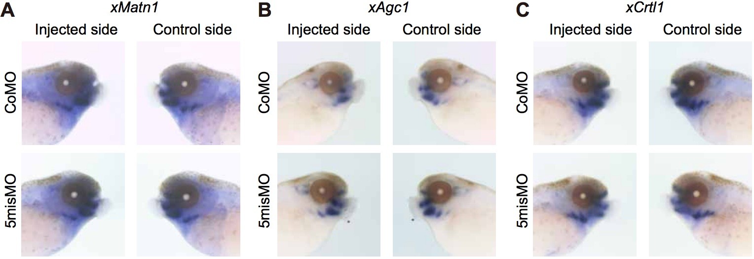 Fig. S5. The expression patterns of chondrocyte markers in Xenopus laevis. (A-C) CoMO or 5misMO was injected unilaterally into the animal pole of two blastomeres (10 ng/cell) at the four-cell stage, and the embryos were fixed at stage 41. Whole-mount in situ hybridization was performed with xMatn1 (A), xAgc1 (B) and xCrtl1 (C) probes. Frequency of specimen with the indicated phenotype (nearly equal expression) was CoMO in A, 9/11; 5misMO in A, 7/10; CoMO in B, 10/11; 5misMO in B, 11/12; CoMO in C, 9/11; xMLTK-MO in C, 12/12. |