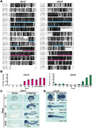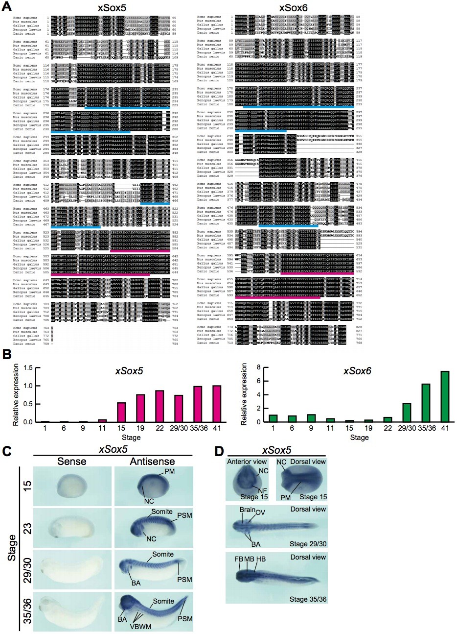 Fig. S6. Characterization of Xenopus laevis Sox5 and Sox6. (A) Amino acid sequence alignment of Sox5 or Sox6 proteins from human (Homo sapiens) (Sox5, NP_008871; Sox6, NP_001139291), mouse (Mus musculus) (Sox5, NP_035574; Sox6, NP_035575), chicken (Gallus gallus) (Sox5, CAF25288; Sox6, XP_421000), frog (Xenopus laevis) (Sox5, AB682776; Sox6, AB682777) and zebrafish (Danio rerio) (Sox5, AAI63449; Sox6, NP_001116481). Identical and highly conserved amino acids are highlighted in black and gray boxes, respectively. Dashed lines indicate gaps. Two potential coiled-coil domains and the HMG box are underlined in blue and magenta, respectively. (B) The temporal expression patterns of xSox5 and xSox6 during embryonic development were analyzed by qRT-PCR. (C) Whole-mount in situ hybridization for xSox5 was performed on embryos at stages 15, 23, 29/30 and 35/36. NC, neural crest; PM, paraxial mesoderm; PSM, presomitic mesoderm; BA, branchial arch; VBWM, ventral body wall muscle. (D) Anterior and dorsal view of embryos shown in C. NC, neural crest; NF, neural fold; PM, paraxial mesoderm; OV, otic vesicle; BA, branchial arch; FB, forebrain; MB, midbrain; HB, hindbrain. |