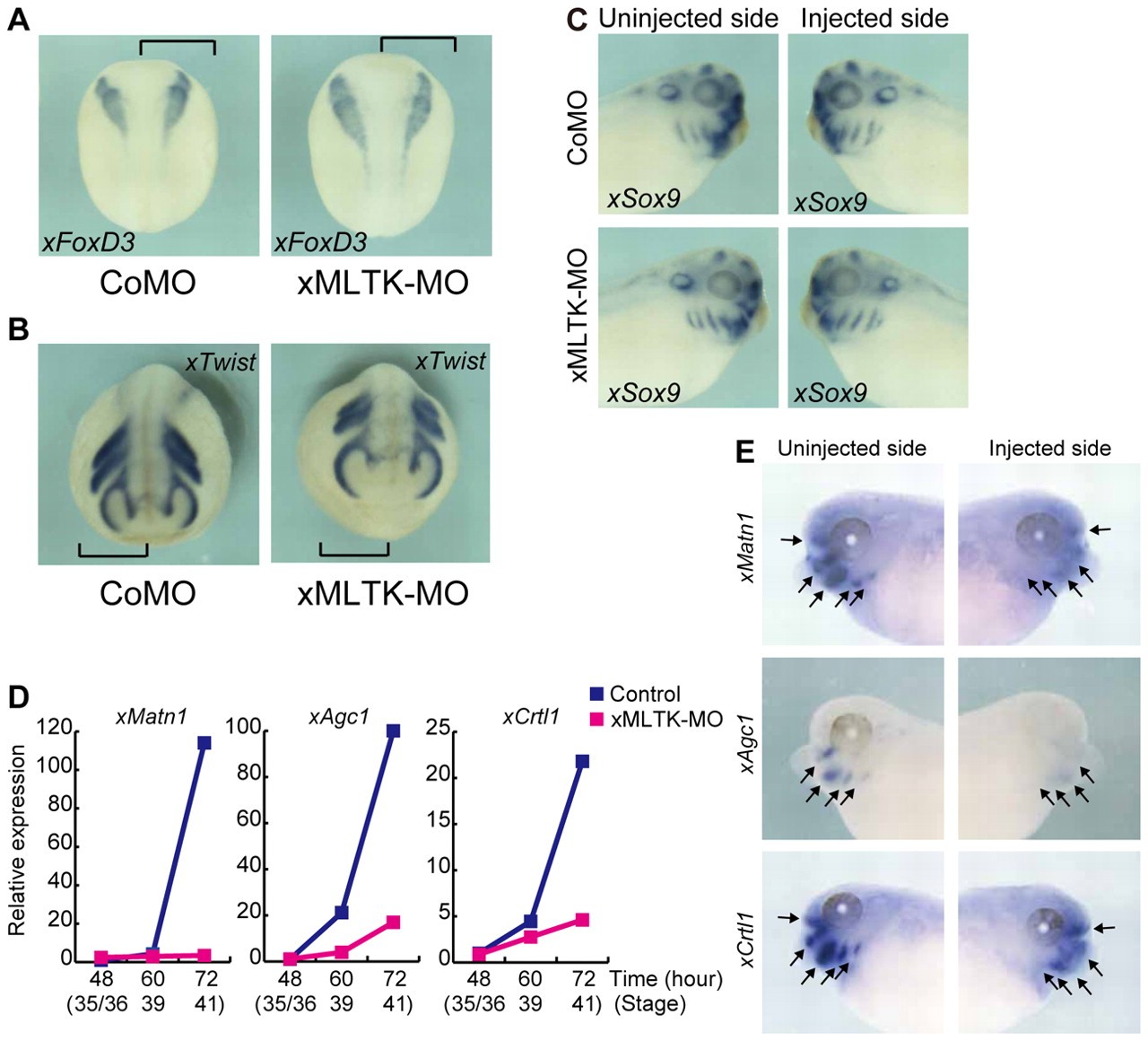 Fig. 2. xMLTK is required for chondrocyte differentiation but not for neural crest development. (A-C) xMLTK-MO or CoMO was injected unilaterally into the animal pole of two blastomeres (10 ng/cell) at the four-cell stage, and the embryos were fixed at stages 17 (A), 19 (B) and 35/36 (C). Whole-mount in situ hybridization was performed with xFoxD3 (A), xTwist (B) and xSox9 (C) probes. Brackets indicate the injected side. Frequency of specimen with the indicated phenotype (nearly equal expression) was CoMO in A, 11/11; xMLTK-MO in A, 17/19; CoMO in B, 5/6; xMLTK-MO in B, 15/15; CoMO in C, 13/13; xMLTK-MO in C, 10/12. (D) xMLTK-MO was injected into the animal pole of all blastomeres (10 ng/cell) at the four-cell stage. The heads of uninjected and injected embryos were cut out and harvested at 48, 60 and 72 hours after fertilization (corresponding to stages 35/36, 39 and 41, respectively). The expression levels of chondrocyte markers xMatn1, xAgc1 and xCrtl1 were analyzed by qRT-PCR. Representative results from two independent experiments are shown. (E) xMLTK-MO was injected unilaterally into the animal pole of two blastomeres (10 ng/cell) at the four-cell stage, and the embryos were fixed at stage 41. Whole-mount in situ hybridization was performed with xMatn1, xAgc1 and xCrtl1 probes. Arrows indicate presumptive cartilaginous elements. Frequency of specimen with the indicated phenotype (markedly reduced expression) was xMatn1, 19/21; xAgc1, 20/20; xCrtl1, 17/19. |