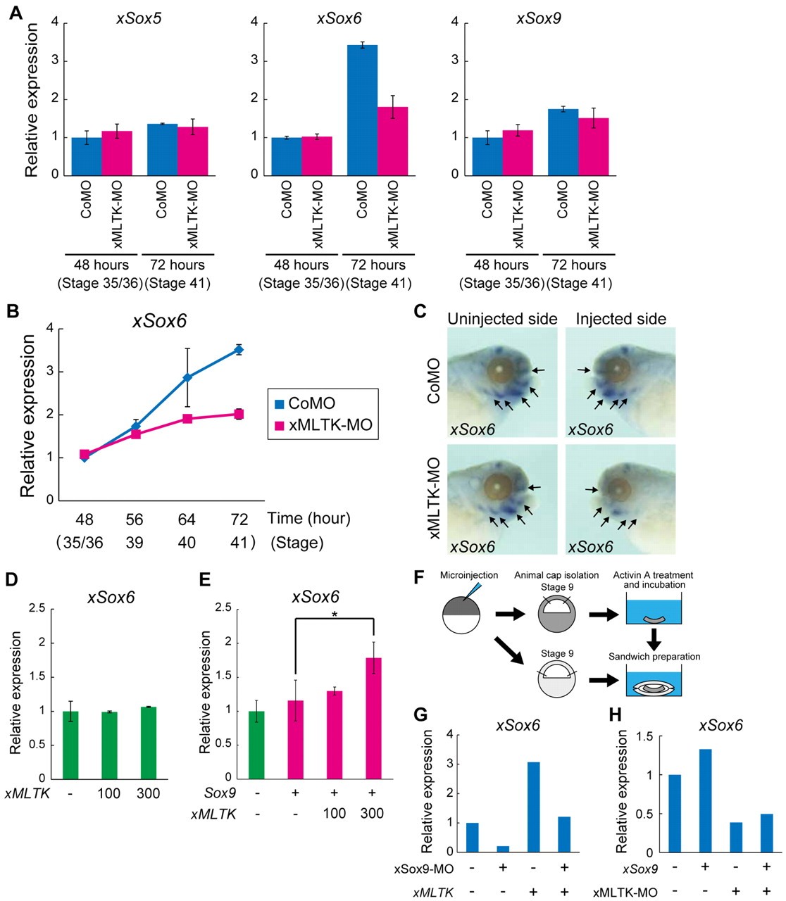 Fig. 3. xMLTK is required for xSox6 expression. (A) xMLTK-MO or CoMO was injected into the animal pole of all blastomeres (10 ng/cell) at the four-cell stage. The heads of embryos were cut out and harvested 48 and 72 hours after fertilization (corresponding to stages 35/36 and 41, respectively). The expression levels of xSox5, xSox6 and xSox9 were analyzed by qRT-PCR. Values are mean±s.d. of three independent experiments. (B) xMLTK-MO or CoMO was injected into the animal pole of all blastomeres (10 ng/cell) at the four-cell stage. The heads of embryos were cut out and harvested 48, 56, 64 and 72 hours after fertilization (corresponding to stages 35/36, 39, 40 and 41, respectively). The expression level of xSox6 was analyzed by qRT-PCR. Values are means ±s.d. of two independent experiments. (C) xMLTK-MO or CoMO was injected unilaterally into the animal pole of two blastomeres (10 ng/cell) at the four-cell stage, and the embryos were fixed at stage 41. Whole-mount in situ hybridization was performed with xSox6 probe. Arrows indicate presumptive cartilaginous elements. Frequency of specimen with the indicated phenotype (nearly equal expression in CoMO-injected embryos; markedly reduced expression in xMLTK-MO-injected embryos) was CoMO, 24/24; xMLTK-MO, 50/63. (D) xMLTKα-myc and xMLTKβ-myc mRNAs (50 or 150 pg of each/embryo) were injected into the animal region of two ventral blastomeres at the four-cell stage, and the embryos were harvested at stage 10.5. The expression level of xSox6 was analyzed by qRT-PCR. Values are mean±s.d. of two independent experiments. (E) HA-xSox9 mRNA (150 pg/embryo) was co-injected with or without both xMLTKα-myc and xMLTKβ-myc mRNAs (50 or 150 pg of each/embryo) into the animal region of two ventral blastomeres at the four-cell stage, and the embryos were harvested at stage 10.5. The expression level of xSox6 was analyzed by qRT-PCR. Values are mean±s.d. of three independent experiments. *P<0.05. (F) Schematic of sandwich culture experiments. (G) xMLTKα and xMLTKβ mRNAs (150 pg of each/embryo) and/or xSox9-MO (5 ng/embryo) were injected at the one-cell stage, and the embryos were used for sandwich culture experiments. Sandwiched explants were cultured for 72 hours and the expression level of xSox6 was analyzed by qRT-PCR. Representative results from two independent experiments are shown. (H) xSox9 mRNA (150 pg/embryo) and/or xMLTK-MO (40 ng/embryo) were injected at the one-cell stage, and the embryos were used for sandwich culture experiments. Sandwiched explants were cultured for 72 hours and the expression level of xSox6 was analyzed by qRT-PCR. Representative results from two independent experiments are shown. |