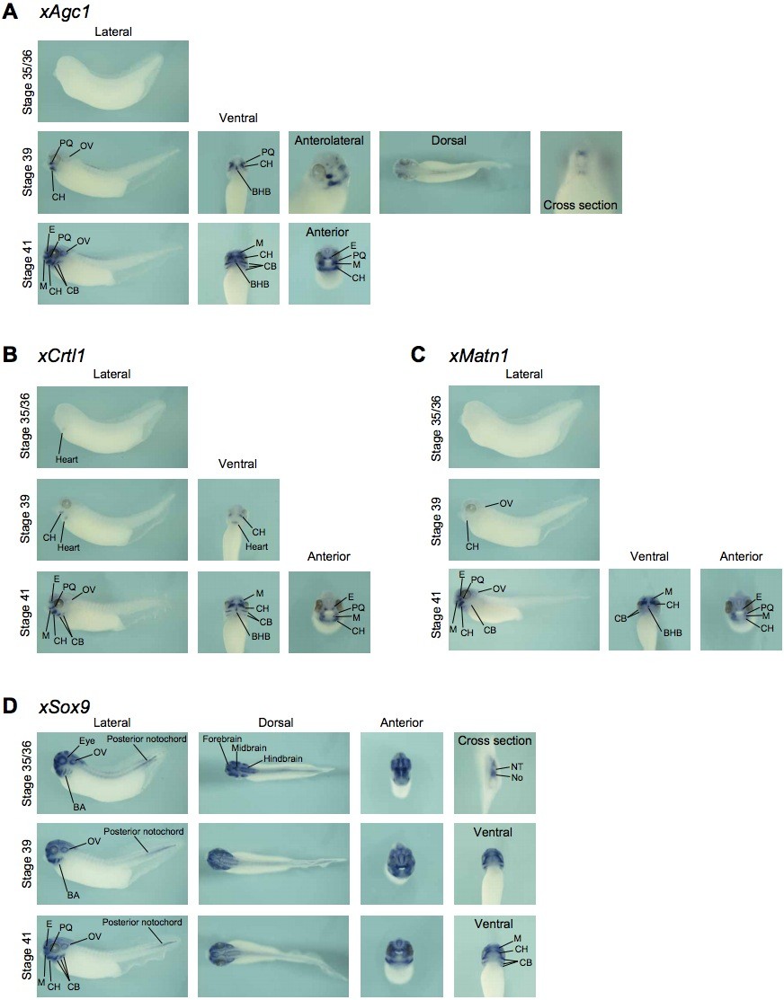 Fig. S4. The expression patterns of chondrocyte markers in Xenopus laevis. (A-D) Whole-mount in situ hybridization for xAgc1 (A), xCrtl1 (B), xMatn1 (C) and xSox9 (D) was performed on embryos at stages 35/36, 39 and 41. OV, otic vesicle; BA, branchial arch; NT, neural tube; No, notochord; M, Meckel cartilage; CH, ceratohyal cartilage; CB, ceratobranchial cartilage; BHB, basihyobranchial cartilage; E, ethmoid cartilage; PQ, palatoquadrate cartilage. |