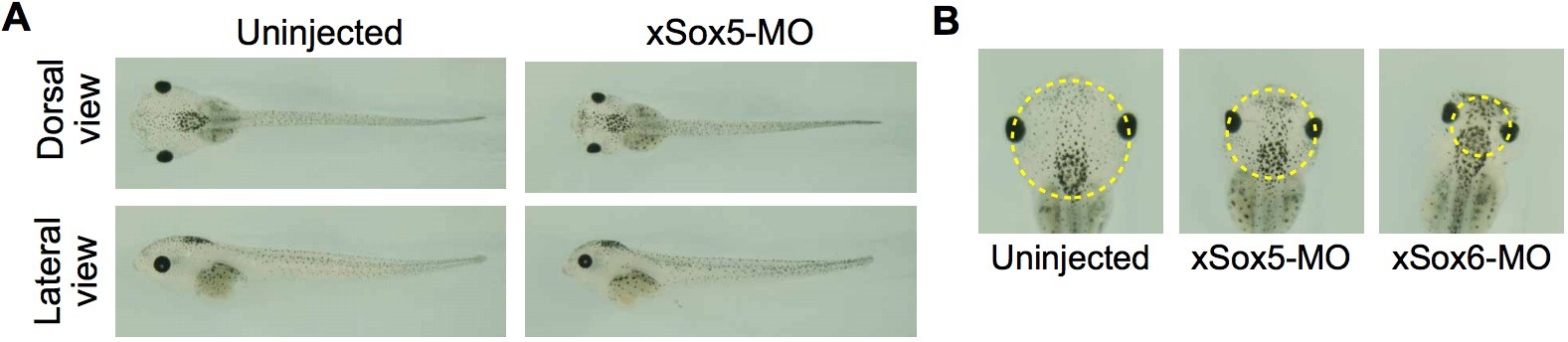 Fig. S7. Knockdown of xSox5 and xSox6 in the Xenopus embryo. (A) xSox5-MO was injected into the animal pole of all blastomeres (10 ng/cell) at the four-cell stage, and the embryos were fixed at stage 45. The images of the uninjected embryo are the same as shown in Fig. 4B. (B) Magnified view of the head of embryos shown in Fig. 4B and A. Craniofacial cartilage is outlined with a dashed yellow line. |