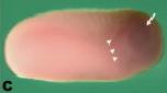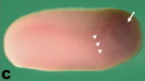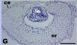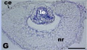 Figure 2. Xenopus MADM-like (xMADML) expression. A-F: Embryonic expression of xMADML by in situ hybridization. Anterior is to the right in all cases. White arrowheads denote the rightlateral extent of anterior staining, and white arrows indicate eye and lens placode staining. A is a dorsal view, dorsal is up in B-F. A: Stage 14: faint xMADML expression visible in the anterior neural plate. The black arrowhead indicates the blastopore, and the dotted line indicates the dorsal midline of the embryo. B: Stage 19: faint xMADML expression visible in a region of the anterior neural plate and adjacent headectoderm. C-E: Stages 25, 32, and 35, respectively: revealing expression in the presumptive lensectoderm (PLE), lens, retina, and surrounding areas. F: Stage 35 sense control showing no staining. G: Section of eye of animal shown in E. H: RT-PCR analysis of xMADML expression in stages as noted. Lane 1 is the 1-kb DNA ladder, lane 2 is a negative control, and lane 3 is positive control plasmid. The white arrow indicates the expected 1,513-bp amplified product, based on the full-length cDNA coding sequence recovered. The white arrowheads indicate two alternative splice forms (see text). ce, corneal epithelium; le, lens; nr, neural retina. Scale bar = 400 mu m in A-F, 100 mu m in G.