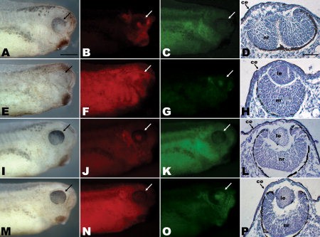 Figure 7. Reciprocal presumptive lensectoderm (PLE) transplants. Embryos were injected unilaterally at the two-cell stage with either morpholino or rhodamine green dextran, and PLEs were transplanted between injected animals at stage 14. The resulting stage 35 larvae are shown. For the panels in the first three columns, anterior is to the right and dorsal is up. Arrows indicate the locations of eyes. For the panels in the fourth column, dorsal is to the right. Each row shows, left to right, one embryo as whole-mount in transmitted light, red morpholino fluorescence, and green dextran fluorescence, and the affected eye in section, respectively. AâD: Rhodamine green dextran host with a red lissamine Xenopus MADM-like (xMADML) morpholino (MO) PLE transplant. EâH: Red lissamine xMADML-MO host with rhodamine green dextran PLE transplant. IâL: Rhodamine green dextran host with a red lissamine control morpholino (CTL-MO) PLE transplant. MâP: Red lissamine CTL-MO host with a rhodamine green dextran PLE transplant. ce, corneal epithelium; le, lens; nr, neural retina. Scale bars = 400 μm in the first three columns, 100 μm in the fourth column.Download figure to PowerPoint