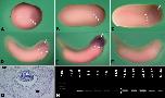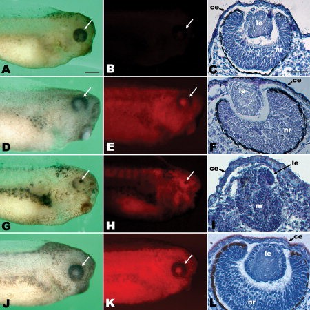 Figure 4. Morpholino phenotype. Stage 35 animals developing from embryos injected unilaterally at the two-cell stage with 18 ng of indicated morpholino (MO). Each row shows one embryo in whole-mount in both white light and red morpholino fluorescence and the affected eye in section in transmitted light. For panels in the first two columns, anterior is to the right and dorsal is up. Arrows indicate the location of eye. For the panels in the third column, dorsal is to the right. AâC: Uninjected control animal. DâF:Xenopus MADM-like (xMADML) -MO injected animal. Mild phenotype showing reduced development of ventralretina and poorly differentiated, misorganized fiber cells in the lens. GâI: xMADML-MO injected animal. Severe phenotype showing retina and lens with severely impaired gross morphology. JâL: Control morpholino (CTL-MO) -injected animal exhibiting normal morphology. ce, corneal epithelium; le, lens; nr, neural retina. Scale bar = 400 μm in the first two columns, 100 μm in the third column.Download figure to PowerPoint