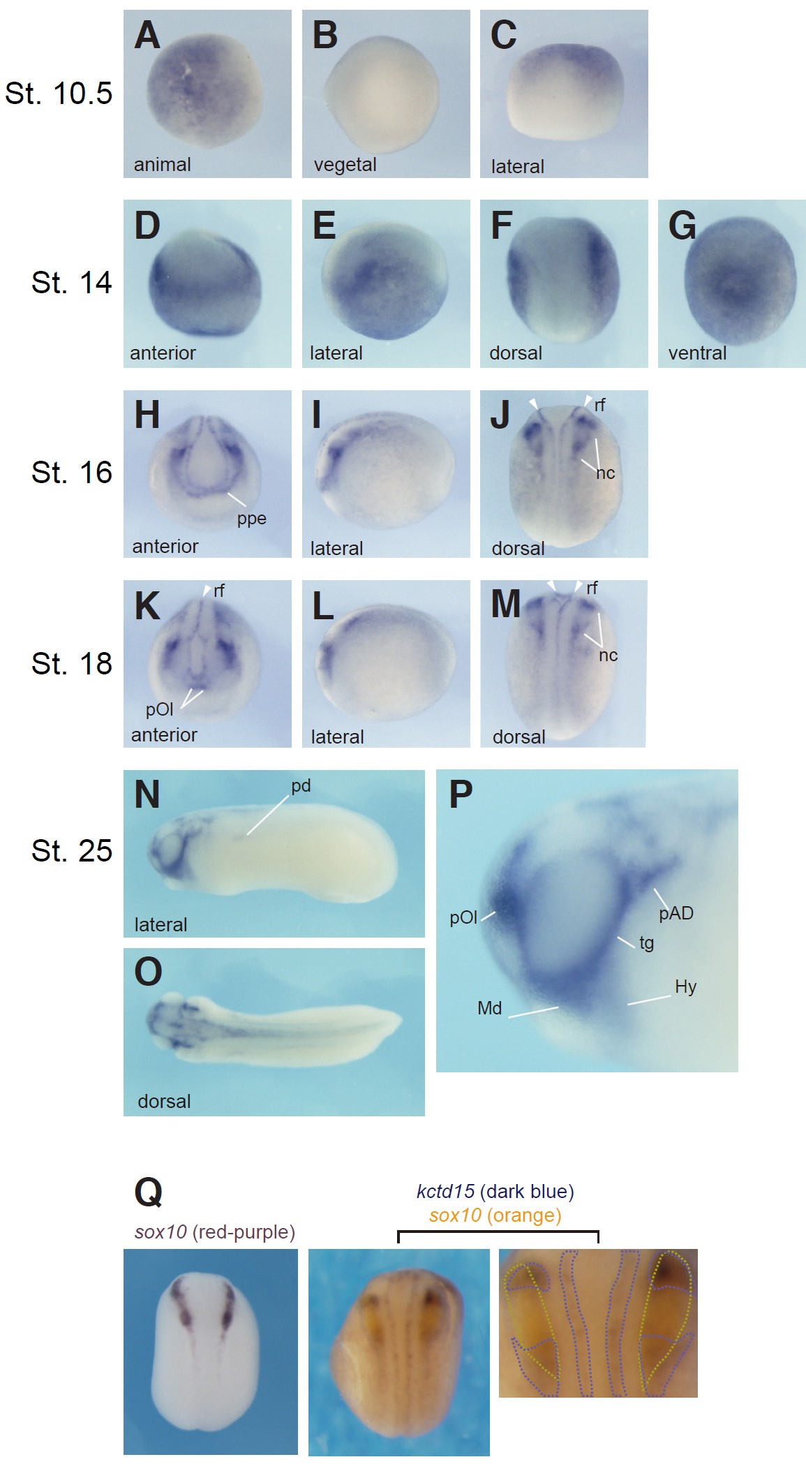 Fig. 2 Spatial expression of Xenopus kctd15 in early development. Whole mount in situ hybridization against kctd15 was performed on embryos from indicated stages. No detectable signal was seen with the sense probe (data not shown). (A-C) At stage 10.5, kctd15 was uniformly expressed throughout the presumptive ectoderm. (D-G) At stage 14, kctd15 expression was detected in the non-neural ectoderm and was excluded from the neural plate. Dorsal is upward in D and E. Anterior is upward in F and G. (H-J) At stage 16, kctd15 expression was detected in the preplacodal ectoderm (ppe), the neural crest (nc) and the roof plate (rf). Dorsal is upward in H and I. Anterior is upward in J. (K-M) At stage 18, kctd15 expression was detected in the neural crest (nc), the roof plate (rf) and the olfactory placode (pOl). Dorsal is upward in K and L. Anterior is upward in M. (N-P) At stage 25, kctd15 expression was detected in the pronephric duct (pd), the mandibular arch (Md), the hyoid arch (Hy), the olfactory placode (pOl), trigeminal ganglia (tg) and the anterodorsal lateral line placode (pAD). Anterior is left. (Q) Whole mount double in situ hybridization against kctd15 and sox10 was performed on stage 17 embryos (middle and right panels). The right panel is an enlarged view of the middle panel. Dark blue and orange dotted lines mark the kctd15-expressing and sox10-expressing area, respectively. For reference, single in situ hybridization against sox10 (red purple) was also performed (the left panel). All panels are dorsal views with anterior to the top. |