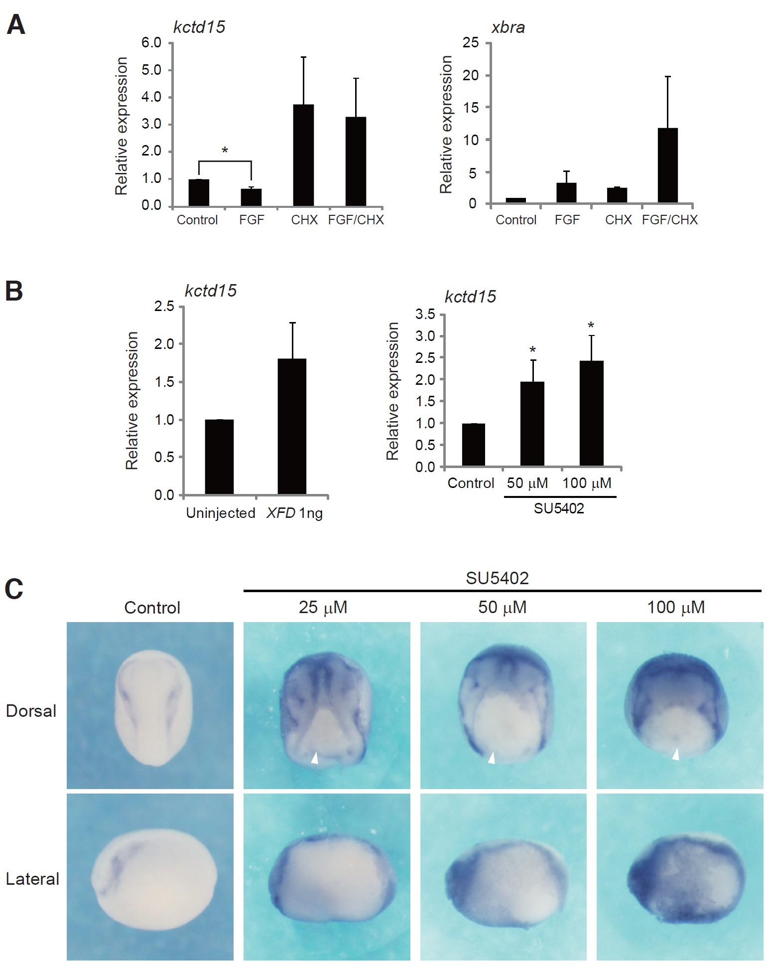Fig. 3. FGF signaling inhibits Xenopus kctd15 expression in vivo. (A) FGF represses kctd15 expression indirectly. Animal caps were dissected at stage 10.25, treated with FGF (100 ng/ml) for 3 hours in the presence or absence of cycloheximide (CHX; 5 mg/ml), and then harvested for real-time quantitative RT-PCR analysis. Shown is the average of two independent experiments. The error bar represents SD. Significant differences are marked by asterisks (*p < 0.05, unpaired t test). P values (FGF treatment versus no FGF treatment) were as follows: 0.024 for kctd15 expression in the absence of CHX, 0.80 for kctd15 expression in the presence of CHX, 0.23 for xbra expression in the absence of CHX, and 0.24 for xbra expression in the presence of CHX. (B) Inhibition of FGF signaling increases the abundance of kctd15 mRNA. XFD mRNA (1 ng) was injected into animal poles at 2-cell stage, and injected embryos were harvested at stage 11 for real-time quantitative RT-PCR analysis (left). Embryos were treated with indicated doses of SU5402 at stage 9, and then harvested at stage 11 for real-time quantitative RT-PCR analysis (right). Shown is the average of two (left) or three (right) independent experiments. The error bar represents SD. *P < 0.05, unpaired t test. P values versus control were as follows: 0.14 for XFD mRNA-injected embryos, 0.031 for SU5402 (50 mM)-treated embryos, and 0.015 for SU5402 (100 mM)-treated embryos. (C) Inhibition of FGF signaling dramatically expands the region expressing kctd15. Embryos were treated with indicated doses of SU5402 at stage 9, fixed at stage 15, and then subjected for whole mount in situ hybridization against kctd15. Upper panels show dorsal views with anterior toward the top. Lower panels show lateral views with anterior to the left. White arrowheads indicate unclosed blastopores, which are commonly observed phenotypes caused by inhibition of the FGF pathway (Amaya et al., 1991; Chung et al., 2004). |