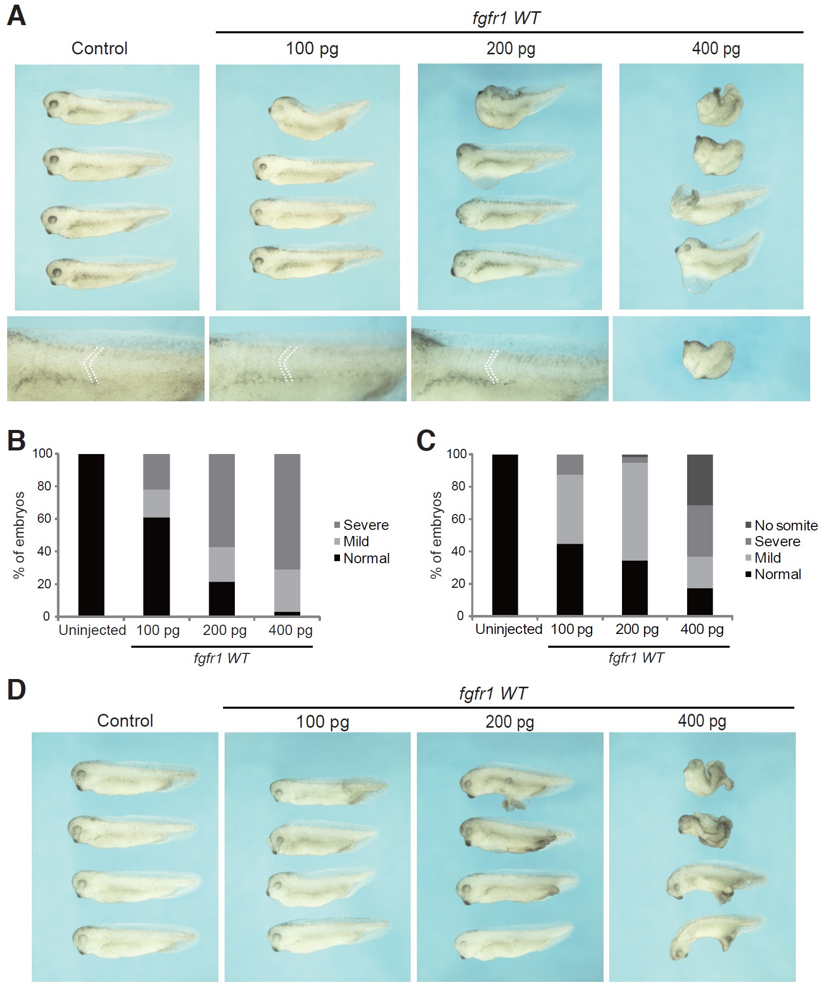 Fig. 6. Ectopic dorsal expression of fgfr1 phenocopies dorsal depletion of Xenopus kctd15. (A) The indicated dose of fgfr1 WT mRNA was injected into the animal pole of each dorsal blastomere at the four-cell stage. Embryos were photographed at the late tailbud stage. (B) Obtained phenotypes were classified into three groups (severe, mild or normal) according to the extent of defects in head morphologies. (C) Obtained phenotypes were classified into four groups (no somite, severe, mild or normal) according to the extent of defects in somite formation. (D) The indicated dose of fgfr1 WT mRNA was injected into the animal pole of each ventral blastomere at the four-cell stage. Embryos were photographed at the late tailbud stage. |