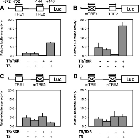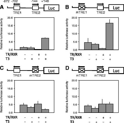 Figure 5. The activation of Xenopus tropicalis Dot1L promoter by liganded TR in vivo is dependent on TRE2. On the top of each panel shows a schematic diagram of the promoter construct with or without mutations in TRE1 (mTRE1) and/or TRE2 (mTRE2). The lower portion shows the promoter activity in the frog oocytes. For the transcription assay, wild type or mutant promoter construct was co-injected with the control Renilla luciferase construct phRG-tk into the nuclei of the oocytes with or without prior cytoplasmic injection of mRNAs for Xenopus tropicalis TRα and RXRβ. The oocytes were incubated at 18°C overnight in the presence or absence of 100 nM T3 and then used for dual luciferase assays. The relative activities of the firefly luciferase to Renilla luciferase were plotted. Error bars indicate s.e.m. Note that mutation of TRE1 alone had no effect on the regulation of the promoter by TR/RXR both in the presence or absence of T3 while mutating of TRE2 alone or together with TRE1 abolished the regulation by TR/RXR, suggesting that TRE2 is the functional TRE