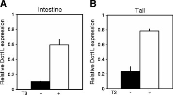 Figure 2. Xenopus tropicalis Dot1L is induced in the intestine and tail upon treatment of premetamorphic tadpoles with T3. Stage 54 tadpoles were treated with 10 nM T3 for 2 days and total RNA was isolated from the intestine (A) and tail (B). qRT-PCR was conducted to examine the expression of Dot1L mRNA. Dot1L expression was normalized to the expression of the control gene EF1α (elongation factor 1α). Error bars indicate s.e.m.