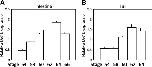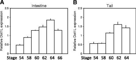Figure 3. Upregulation of Xenopus tropicalis Dot1L expression in the intestine and tail during natural metamorphosis. Total RNA was isolated from the intestine (A) and tail (B) at the indicated developmental stages from premetamorphosis to the end of metamorphosis (stage 66). The expression of Dot1L mRNA was determined by qRT-PCR as in Figure 2. Error bars indicate s.e.m. Note that there were no tail samples at stage 66 (B) as the tail is completely resorbed by stage 66.