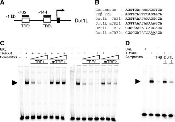 Figure 4. TR binds to the putative TREs in Dot1L gene in vitro. (A) Schematics diagram of the putative TREs in Xenopus tropicalis Dot1L gene. The TREs are shown as white boxes with arrows indicating the orientation of TREs. The black box shows exon. (B) The sequences of wild type and mutant Dot1L TRE1 and TRE2 used in the gel shift assay in comparison to the consensus TRE and the TRE of Xenopus laevis TRβA gene. Bold letters show conserved nucleotides and the mutated nucleotides are underlined. (C) Both Dot1L TRE1 and TRE2 compete against the TRE of Xenopus laevis TRβA for binding to TR/RXR heterodimers. The labeled Xenopus laevis TRβA promoter TRE was mixed with in vitro translated TR/RXR heterodimers in the presence or absence of 4×, 20×, or 100× unlabeled wild type or mutant Dot1L TRE1 or TRE2 as indicated. The reaction mixture was analyzed by gel retardation assay. Arrowhead indicates the TR/RXR-TRE complex. Note that both wild-type Dot1L TREs competed while the mutations reduced or abolished their ability to compete for binding to TR/RXR. (D) Dot1L TRE2 has higher affinity than TRE1 for TR/RXR heterodimer in vitro. Gel mobility shift assay was done as in (C) except with 20× unlabeled Xenopus laevis TRβA TRE, Dot1L TRE1, and Dot1L TRE2. Note that Xenopus laevis TRβA TRE competed most effectively, followed by Dot1L TRE2, while Dot1L TRE1 was least effective.