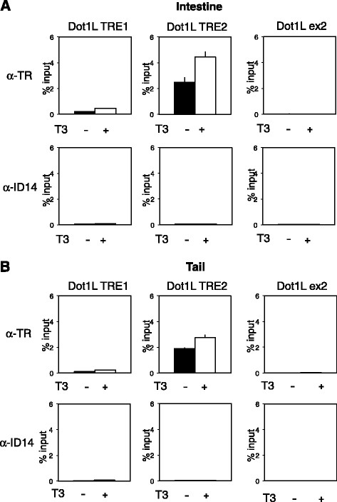 Figure 6. TR binds to the TRE2 in Dot1L promoter in the intestine and tail during T3-induced metamorphosis. Stage 54 tadpoles were treated with or without T3 for 2 days. The intestine (A) or tail (B) was isolated for ChIP assay with a polyclonal antibody against TR (top) or Id14 (bottom), a negative control for antibody specificity. The immunoprecipitated DNA was analyzed by qPCR for the presence of the TRE regions of Dot1L promoter. A region of exon 2 (ex2) of Dot1L gene was analyzed as a negative control for binding specificity. Note that strong binding of TR to TRE2 in Dot1L gene was observed in the absence of T3 in premetamorphic tadpoles and that this binding was increased slightly upon T3 treatment in both organs. TR signal at the TRE1 was very low in both organs with or without T3 treatment, consistent with the results from transcription and in vitro TR binding assays. Only background signals were observed with the anti-ID14 antibody. Error bars indicate s.e.m