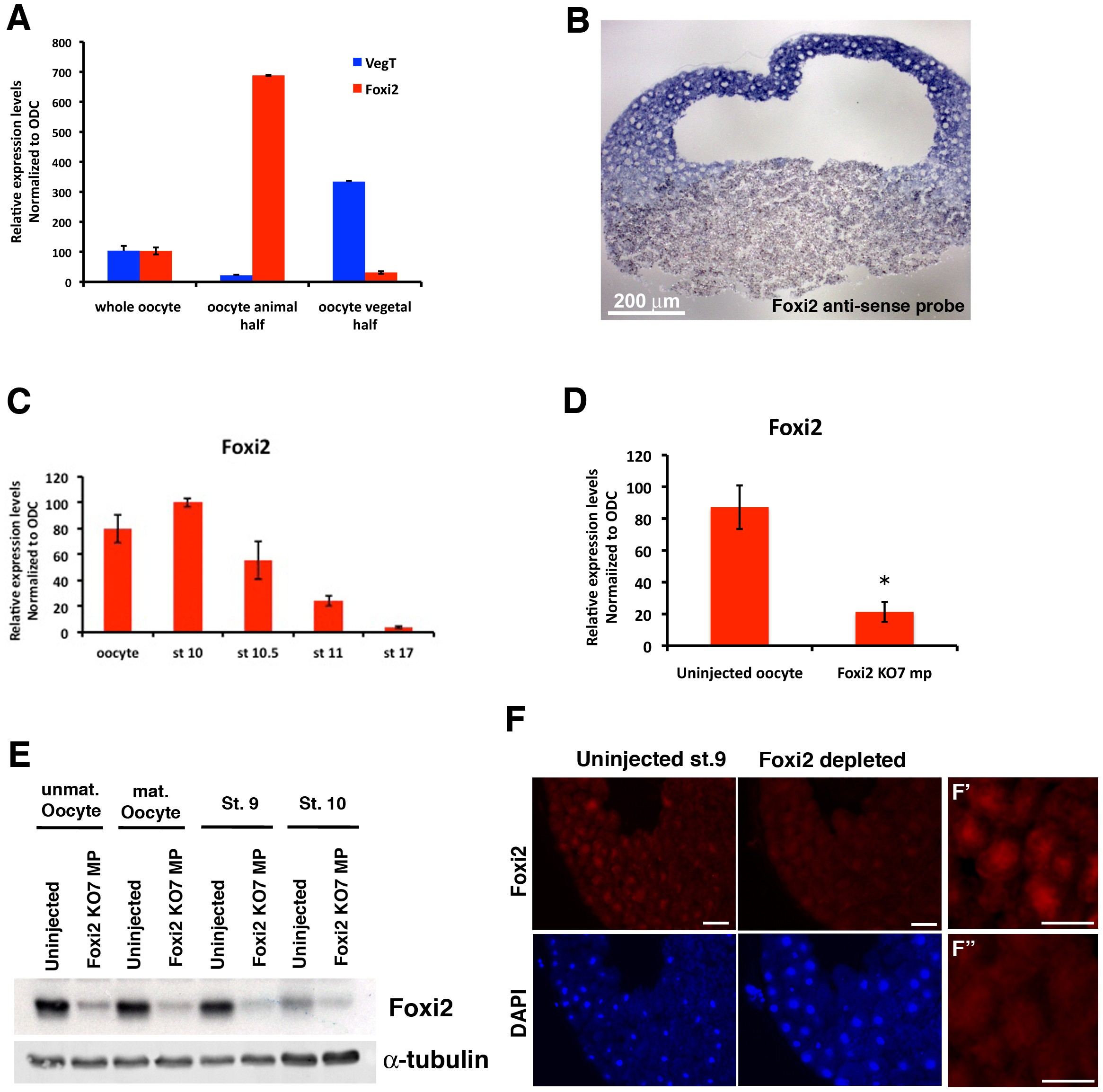 (A) RT-PCR to show relative expression levels of Foxi2 and VegT in either whole oocytes or dissected animal and vegetal halves. Foxi2 and VegT have reciprocal expression domains, with Foxi2 being highly enriched in the animal hemisphere. (B) In situ hybridization of tissue section at the late blastula stage to show distribution of Foxi2 mRNA. (C) RT-PCR analysis of developmental time course to show absence of early zygotic expression of Foxi2. (D) RT-PCR to show degree of depletion of Foxi2 mRNA by antisense oligo. (E�F) Degree of depletion of Foxi2 protein by mRNA depletion; a western blot of oocytes and early stages is shown in (E), and by immunostaining at the late blastula stage in (F). Scale bar in (F) = 50 �m. High magnification Foxi2 immunostaining images from Uninjected (F′) and Foxi2 depleted (F″) embryos. Scale bars in F′ and F″ = 20 �m.