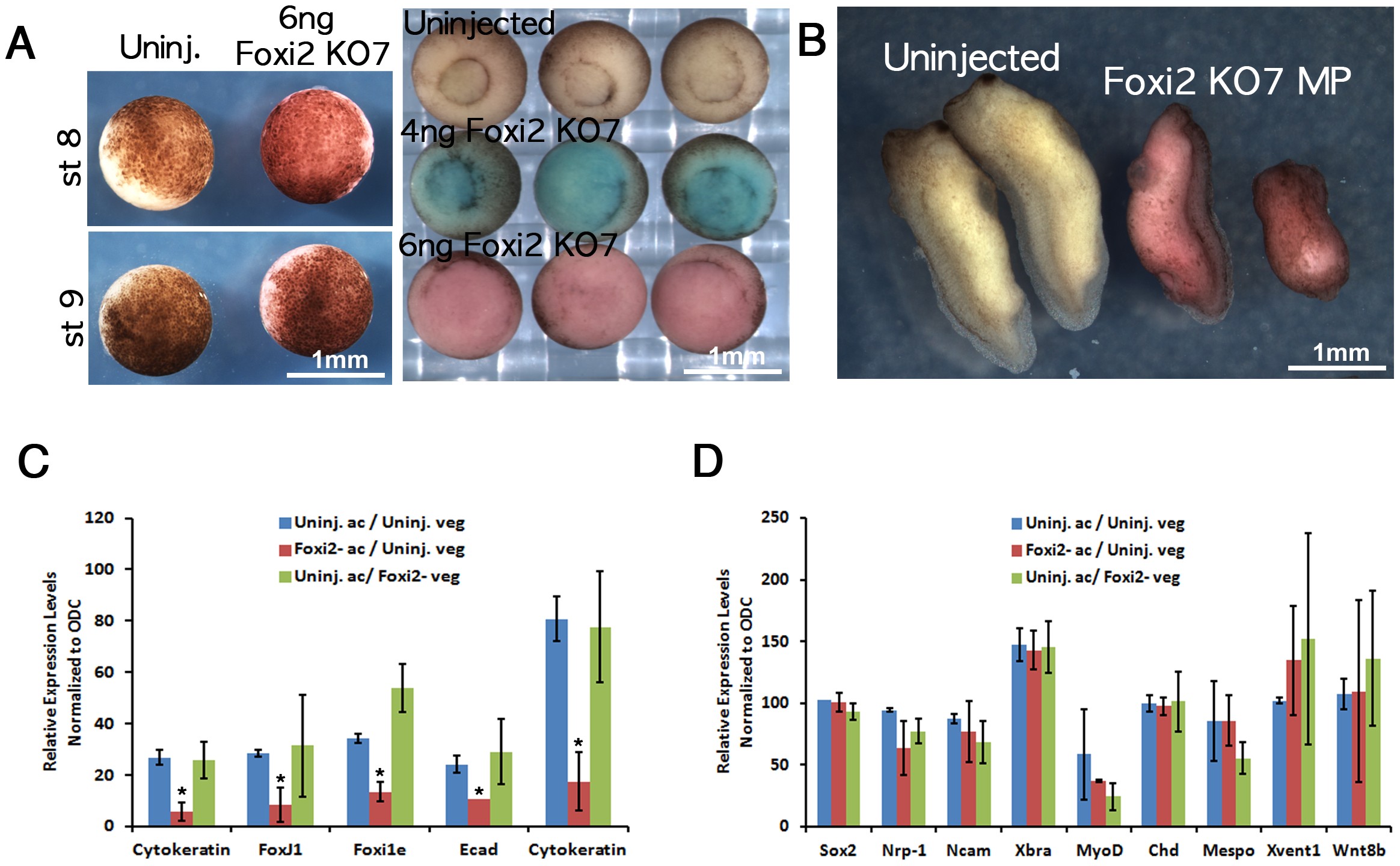 (A) Foxi2-depleted embryos were normal at the blastula stage (left panel) but showed highly delayed and incomplete gastrulation and 37/45 embryos showed major defects at the tail bud stage compared with controls, of which 25/26 were normal (right panel). (C) In Nieuwkoop recombinant assays, Foxi2-depleted animal caps expressed reduced levels of ectodermal markers. (D) Animal caps from Foxi2-depleted embryos express mesodermal markers in response to signals from vegetal masses.