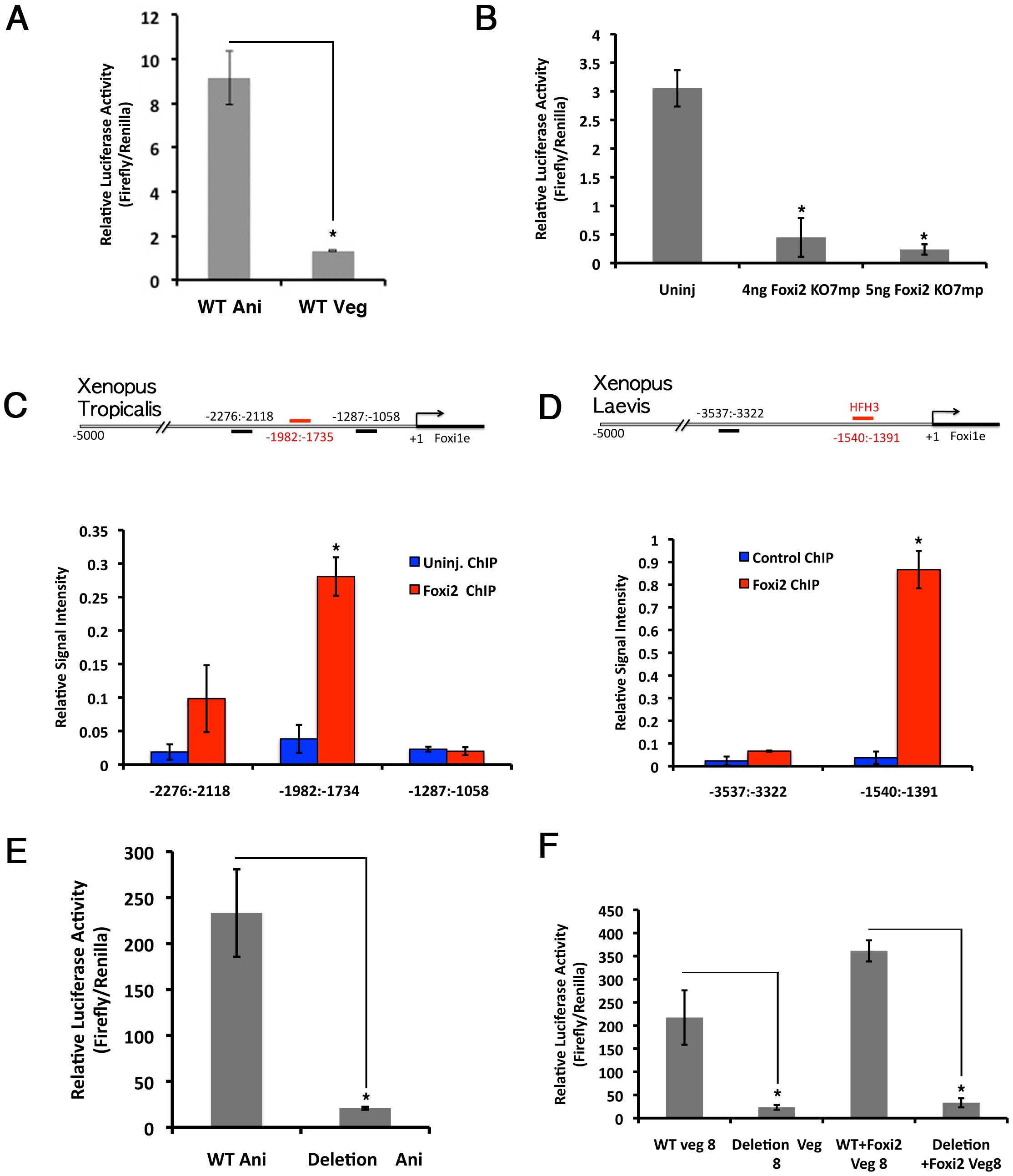 (A) Luciferase activity in blastulae after injecting Xenopus tropicalis Foxi1e promoter-luciferase construct into either animal or vegetal blastomeres at 8-cell stage embryos. (B) Foxi1e promoter activity was measured in blastulae derived from control (uninj) or Foxi2-depleted (4 ng and 5 ng) oocytes. (C,D) Chromatin immunoprecipitation assay. (C) A schematic diagram of Xenopus tropicalis Foxi1e promoter shows potential Foxi2 binding sites and ChIP PCR primer amplicons. Real-time PCR shows significantly higher signal on primer pair −1982:−1734 after immunoprecipation by 6-myc-tagged Foxi2 protein. (D) A schematic diagram of Xenopus laevis Foxi1e promoter shows potential Foxi2 binding sites and ChIP PCR primer amplicons. Real-time PCR shows significantly higher signal on primer pair −1540:−1391 after immunoprecipation by myc-tagged Foxi2 protein. (E) Luciferase activity in blastulae after injecting either wild-type (WT) Xenopus tropicalis Foxi1e promoter constructs or a construct lacking the Foxi2 binding region (Deletion). While wild-type promoter showed its activity (WT Ani), the construct lacking the Foxi2 binding site mutated promoter showed a basal level of promoter activity (Deletion Ani). (F) Luciferase activity in blastulae after injecting Wild-type and Deletion Xenopus tropicalis Foxi1e promoter constructs into vegetal blastomeres. Foxi1e promoter construct lacking the Foxi2 binding site showed a basal level of promoter activity (Deletion Veg 8) while Foxi2 overexpression in vegetal blastomeres had no effect on this mutated construct (Deletion+Foxi2 Veg 8) while wild-type promoter showed increased luciferase activity upon overexpression of Foxi2 (WT+Foxi2 Veg 8).