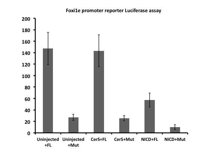 Foxi1e promoter construct is responsive to perturbations of Notch signaling but is not responsive to the influence of Nodal signaling. Either control (FL) or a construct lacking the Foxi2 binding region (Mut) Xenopus tropicalis Foxi1e promoter-luciferase constructs were injected into animal blastomeres of 8-cell stage embryos. When reporter-injected embryos are co-injected with mRNA encoding the Notch intracellular domain (NICD) to activate Notch signaling, there is a 5-fold reduction in luciferase activity of the wild-type promoter construct. Ectopic activation of Notch signaling also gives a 2.5-fold reduction in the activity of the promoter construct that lacks the Foxi2 binding domain (Mut). Foxi1e luciferase activity is unaffected by perturbing Nodal signaling via injection of Cerberus Short (CerS) mRNA.