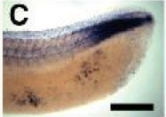 fbn3 (fibrillin 3) gene expression in Xenopus laevis embryo, assayed via in situ hybridization, NF stage 32, tail region only, lateral view, anterior left, dorsal up. |