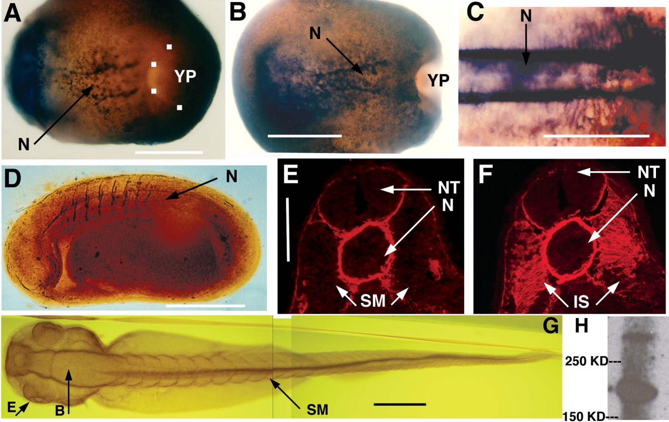 Figure 4. Localization of XF protein in the embryo. XF protein is detected by immunostaining. Anterior is to the left in A-D and G. Dorsal is up in D-F, and G is a dorsal view from above. A: Dorsal view of St-11 whole mount. White squares identify the location of the blastopore lip. B: Dorsal view of St-12 whole mount. C: Dorsal, mid axial-posterior close-up of St-13 whole mount. D: Lateral view of a St-22 whole mount. E: Cross-section through mid-axis of St-22 embryo. Scale bar is for E and F. F: Adjacent cross-section through mid-axis of St-22 embryo, revealing periodic, orthogonoal intersomitic staining. G: Dorsal view of a St-39 embryo. H: Western blot of St-16 embryo extract probed with the JB3 antibody revealing a single band in the size range of fibrillin isoforms (350 kD), as well as a second, smaller band (200 kD). YP, yolk plug; N, notochord; SM, somitic mesoderm; NT, neural tube; IS, intersomitic space; E, eye; B, brain. Scale bars = 0.125 mm (C, E/F), 0.25 mm (A,B), and 0.5 mm (D,G). |