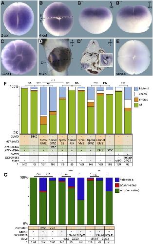 Figure S1. ATP4a Expression, MO Targeting and Morphant Phenotypes, Related to Figure 1(A�D) Expression of ATP4a mRNA (A) and protein (B-D). (A) RT-PCR analysis. Actin served as loading control. Note that mRNA levels decreased but expression persisted through stage 17. (B-D) Immunohistochemistry with an antibody previously used for ATP4a localization in Xenopus (Aw et al., 2008). (B, C) Z-stack projections; (D) individual frames. (B) Gastrula embryo at stage 10.5. ATP4a (Bâ²) was ubiquitously expressed, including the superficial mesoderm on top of the dorsal lip of the blastopore (dotted line). (C) Dorsal explant at stage 17. Ventral view of the GRP at the boundary between the GRP and lateral endodermal crest (LEC) cells (dotted line). Double staining with an antibody against acetylated tubulin (green) in (Câ²) revealed cilia at the GRP and midbodies in the area of the LECs (shown at higher magnification in insets). (D) Optical sections of region outlined in (C) at levels indicated in schematic drawing demonstrated localized staining at membranes as well as in vesicle-like cytoplasmic structures.(E) Injection of lineage tracer rhodamine-B dextran into the marginal region (prospective C-tier of 32-cell embryo) of 4-cell embryos revealed specific targeting of GRP tissue only when dorsal blastomeres were injected close to the dorsal pole (dorsal marginal zone, DMZ, top). More lateral injections of dorsal blastomeres (C2 lineage) or injection of ventral blastomeres (C3 and C4) targeted the intermediate mesoderm (C2/C3), lateral plate mesoderm (C2/C3), and ventral mesoderm (VMZ), respectively.(F and G) Pitx2c expression patterns (F) and organ situs (G) encountered in ATP4a morphants. The outflow tract of the heart and the position of the gall bladder are indicated by green and red arrowheads, respectively, and the direction of gut looping is marked by yellow arrows. Note that morphants occasionally (and dose-dependently) developed cysts, and therefore organ situs could not be determined. |