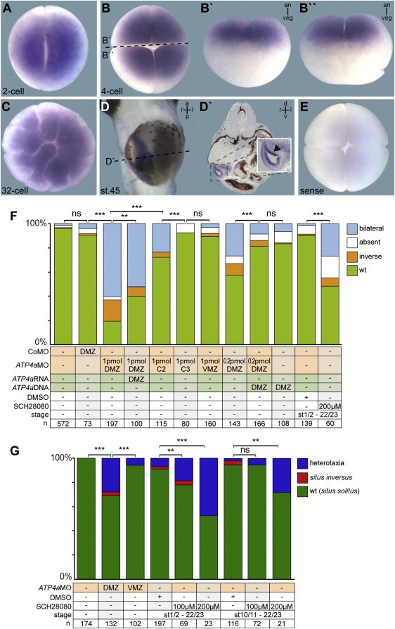 Figure 1. ATP4a Is Symmetrically Expressed and Required Post-MBT for LR Development(A�E) Whole-mount in situ hybridization of staged embryos at the (A) two-cell, (B) four-cell, and (C) 32-cell stages. Note that ATP4a mRNA was enriched in the animal cytoplasm, as shown in the bisected four-cell embryo in (B), viewed from the inner surface in (Bâ²) and (B�), but symmetrically expressed with respect to the LR axis. (D) Zygotic ATP4a expression in the stomach of a stage (st.) 45 tadpole; see plane of section in (Dâ²) indicated by dashed line in (D). Arrowhead indicates gastric epithelium in blow-up. (E) Four-cell embryo stained with sense control RNA.(F and G) (F) Pitx2c expression and (G) organ situs in wild-type embryos at tadpole stages (26�32) and in specimens injected or treated as specified. The image in (Dâ²) was reconstructed from several images taken from the same histological section. ââHighly significant. âââVery highly significant. ns, not significant; n, number of embryos analyzed; wt, wild-type.See also Figure S1.