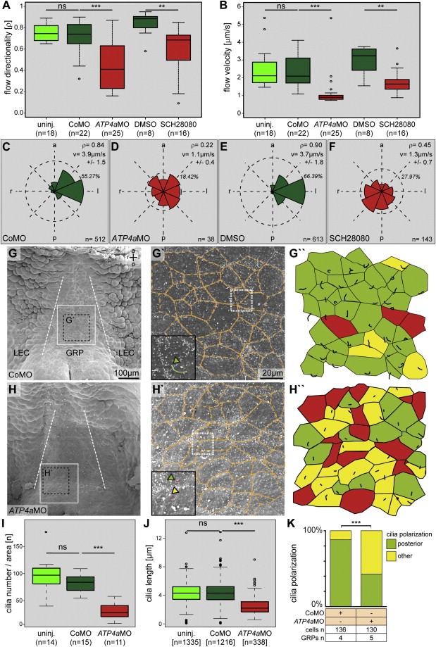 Figure 2. Impaired Ciliation and Leftward Flow upon ATP4 Loss of Function(A�F) Flow analysis. (A) Directionality and (B) velocity of fluorescent beads added to GRP explants at stage 17 were drastically reduced in ATP4a morphants or SCH28080-treated specimens, as compared to wild-type, CoMO-injected, or DMSO-treated embryos. n represents number of explants analyzed. (C�F) Frequency distribution of trajectory angles in representative explants injected with (C) CoMO, (D) ATP4aMO, (E) DMSO, and (F) SCH28080. Dashed circles indicate maximum frequency in histogram specified in percent. a, anterior; l, left; n, number of particles above threshold; p, posterior; r, right; v, average velocity of particles; Ï, quality of flow.(G�K) SEM analysis of GRP ciliation and morphology. (G and H) Representative dorsal explants reveal shorter cilia, fewer ciliated cells, and polarization defects in (H) ATP4a morphant (H) as compared to (G) CoMO-injected specimen. Cell boundaries are indicated by dashed orange lines in higher magnification of SEM pictures in (Gâ²) and (Hâ²). Blowups in (Gâ²) and (Hâ²) illustrate a long and posteriorly polarized cilium in (Gâ²), indicated by a green arrowhead, and two short cilia in (Hâ²), of which one emerges in a central position, indicated by a yellow arrowhead. (G� and H�) Evaluation of cilia polarization. Green, posterior; yellow, other; red, no cilium. (I�K) Quantification of (I) ciliation rate and (J) cilia length of GRP cilia in defined areas, as indicated by white squares in (G) and (H). (K) Cilia polarization was assessed in areas of defined size, as indicated by dashed boxes in (G) and (H). ââHighly significant. âââVery highly significant. ns, not significant. Numbers indicate number of dorsal explants (in parentheses) or cilia (in brackets) analyzed.See also Figure S2 and Movie S1. |