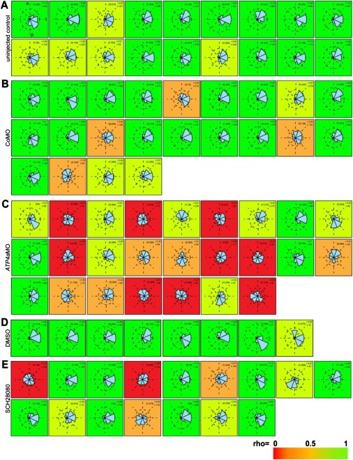 Figure S2. Frequency Distribution of Trajectory Angles in Dorsal Explants, Related to Figure 2(A) Uninjected controls.(B) CoMo-injected controls.(C) ATP4aMO-injected specimens.(D) DMSO- and (E) SCH28080-treated embryos. Dashed circles mark maximum frequency in histogram specified in percent. a, anterior; l, left; n, number of particles above threshold; p, posterior; r, right; v, average velocity of particles; rho, quality of flow.
