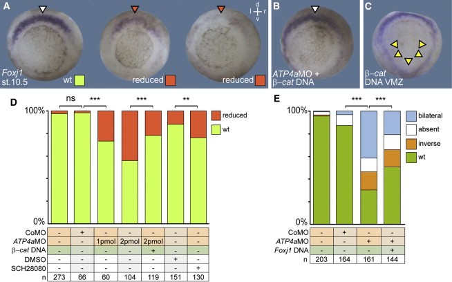 Figure 5. ATP4 Is Required for Wnt/β-cat-Mediated Induction of Foxj1 During Gastrulation(A�C). Reduced mRNA expression of (A) Foxj1 in the SM of ATP4a-morphant or SCH28080-treated embryos was rescued upon coinjection of (B) a β-cat DNA expression construct. (C) Ectopic expression of Foxj1 on the ventral lip following injection of a β-cat DNA expression construct into ventral blastomeres at the four-cell stage (VMZ lineage).(D) Quantification of results.(E) Partial rescue of Pitx2c expression in ATP4a morphants upon coinjection of a Foxj1 DNA expression construct.See also Figure S4. |