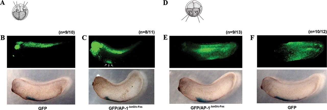 AP-1JunD/c-Fos converts dorsal-fated tissue into ventral-fated tissue (ventralblood island). A and D, illustration of the scheme of the experiment. GFP mRNA (200 pg, B) only (B and F) or GFP together with AP-1 (junD and c-fos, 500 pg) mRNA (C and E) were injected into dorsal animal blastomeres (D1) or ventral animal blastomeres (V1) of eight-cell stage embryos and then cultured until stages 28�30. Embryos were fixed, and GFP expression was observed by green fluorescent microscopy. B and C, dorsally expressed GFP (B, upper panel) is partially transferred into the ventralblood island region (C, three arrows in upper panel). E and F, embryos injected with either GFP alone (F, upper panel) or together with AP-1JunD/c-Fos (E, upper panel) show a similar expression pattern of GFP, which is expressed at the ventroposterior epidermis. The ventralblood island is indicated by in situ hybridization of globin (B�F, lower panel). The number (n) of phenotypes for each group is presented.