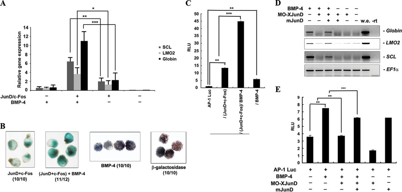 Activator protein-1 (AP-1) regulates a wide range of cellular processes including proliferation, differentiation, and apoptosis. As a transcription factor, AP-1 is commonly found as a heterodimer comprised of c-Jun and c-Fos proteins. However, other heterodimers may also be formed. The function of these dimers, specifically the heterodimeric AP-1 comprised of JunD and c-Fos (AP-1(JunD/c-Fos)), has not been elucidated. Here, we identified a function of AP-1(JunD/c-Fos) in Xenopus hematopoiesis. A gain-of-function study performed by overexpressing junD and c-fos and a loss-of-function study using morpholino junD demonstrate a critical role for AP-1(JunD/c-Fos) in hematopoiesis during Xenopus embryogenesis. Additionally, we confirmed that JunD of AP-1(JunD/c-Fos) is required for BMP-4-induced hematopoiesis. We also demonstrated that BMP-4 regulated JunD activity at the transcriptional regulation and post-translational modification levels. Collectively, our findings identify AP-1(JunD/c-Fos) as a novel hematopoietic transcription factor and the requirement of AP-1(JunD/c-Fos) in BMP-4-induced hematopoiesis during Xenopus hematopoiesis.
