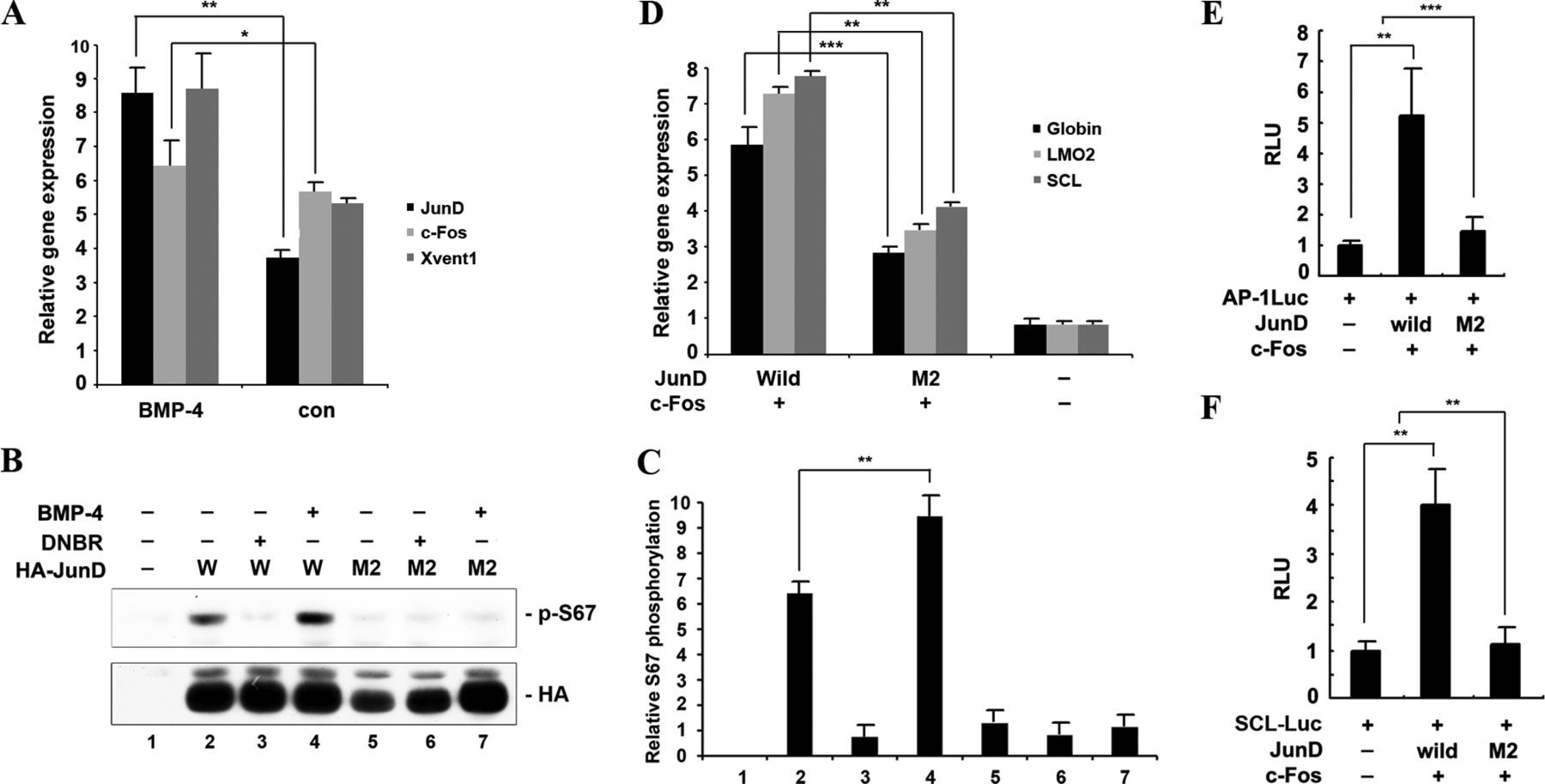 Transcriptional and post-translational modification of AP-1JunD/c-Fos by BMP-4 is required for hematopoiesis. A, BMP-4 activates the transcription of junD, but not c-fos. Xvent1 (ventral marker) was used as a positive control for BMP-4. Animal caps derived from embryos injected with the indicated mRNA were excised and cultured until stage 13 and used for qRT-PCR analysis. con, animal cap samples obtained from non-injected embryos. B, BMP-4 enhances phosphorylation of XJunD at serine 67; in contrast, dominant-negative BMP receptor inhibits the phosphorylation of XJunD. Embryos injected with wild-type HA-junD (W) or mutant HA-junD (M2) alone or in combination with 1 ng of BMP-4 or dominant-negative BMP receptor mRNA were used for Western blotting. Phosphorylation of JunD was analyzed by Western blot using anti-phospho-Jun (α-73). Western blotting with anti-HA shows that equal amounts of expressed JunD were loaded. C, band density was measured using the NIH ImageJ program. D�F, animal caps, explanted from embryos injected with the indicated mRNAs or in combination with the (AP-1)4-luciferase reporter gene or SCL-luciferase reporter gene, were used for qRT-PCR analysis (D) and the luciferase assay (E and F). The concentration of each mRNA injected into embryos was 1 ng. D, AP-1M2JunD/c-Fos shows a lower induction of hematopoietic markers and globin, compared with AP-1JunD/c-Fos. E and F, the AP-1- and SCL-luciferase activities are consistent with D. Data are shown as means ± S.D. of values from at least three independent experiments. RLU, relative luciferase activity. **, p value < 0.01; ***, p value < 0.001.