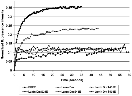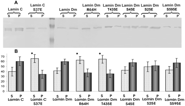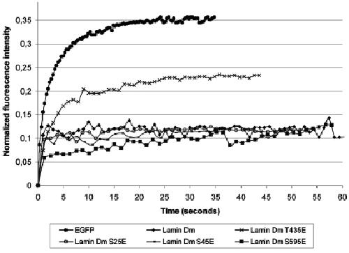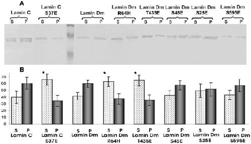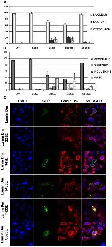 Lamins' functions are regulated by phosphorylation at specific sites but our understanding of the role of such modifications is practically limited to the function of cdc 2 (cdk1) kinase sites in depolymerization of the nuclear lamina during mitosis. In our study we used Drosophila lamin Dm (B-type) to examine the function of particular phosphorylation sites using pseudophosphorylated mutants mimicking single phosphorylation at experimentally confirmed in vivo phosphosites (S(25)E, S(45)E, T(435)E, S(595)E). We also analyzed lamin C (A-type) and its mutant S(37)E representing the N-terminal cdc2 (mitotic) site as well as lamin Dm R(64)H mutant as a control, non-polymerizing lamin. In the polymerization assay we could observe different effects of N-terminal cdc2 site pseudophosphorylation on A- and B-type lamins: lamin Dm S(45)E mutant was insoluble, in contrast to lamin C S(37)E. Lamin Dm T(435)E (C-terminal cdc2 site) and R(64)H were soluble in vitro. We also confirmed that none of the single phosphorylation site modifications affected the chromatin binding of lamin Dm, in contrast to the lamin C N-terminal cdc2 site. In vivo, all lamin Dm mutants were incorporated efficiently into the nuclear lamina in transfected Drosophila S2 and HeLa cells, although significant amounts of S(45)E and T(435)E were also located in cytoplasm. When farnesylation incompetent mutants were expressed in HeLa cells, lamin Dm T(435)E was cytoplasmic and showed higher mobility in FRAP assay.