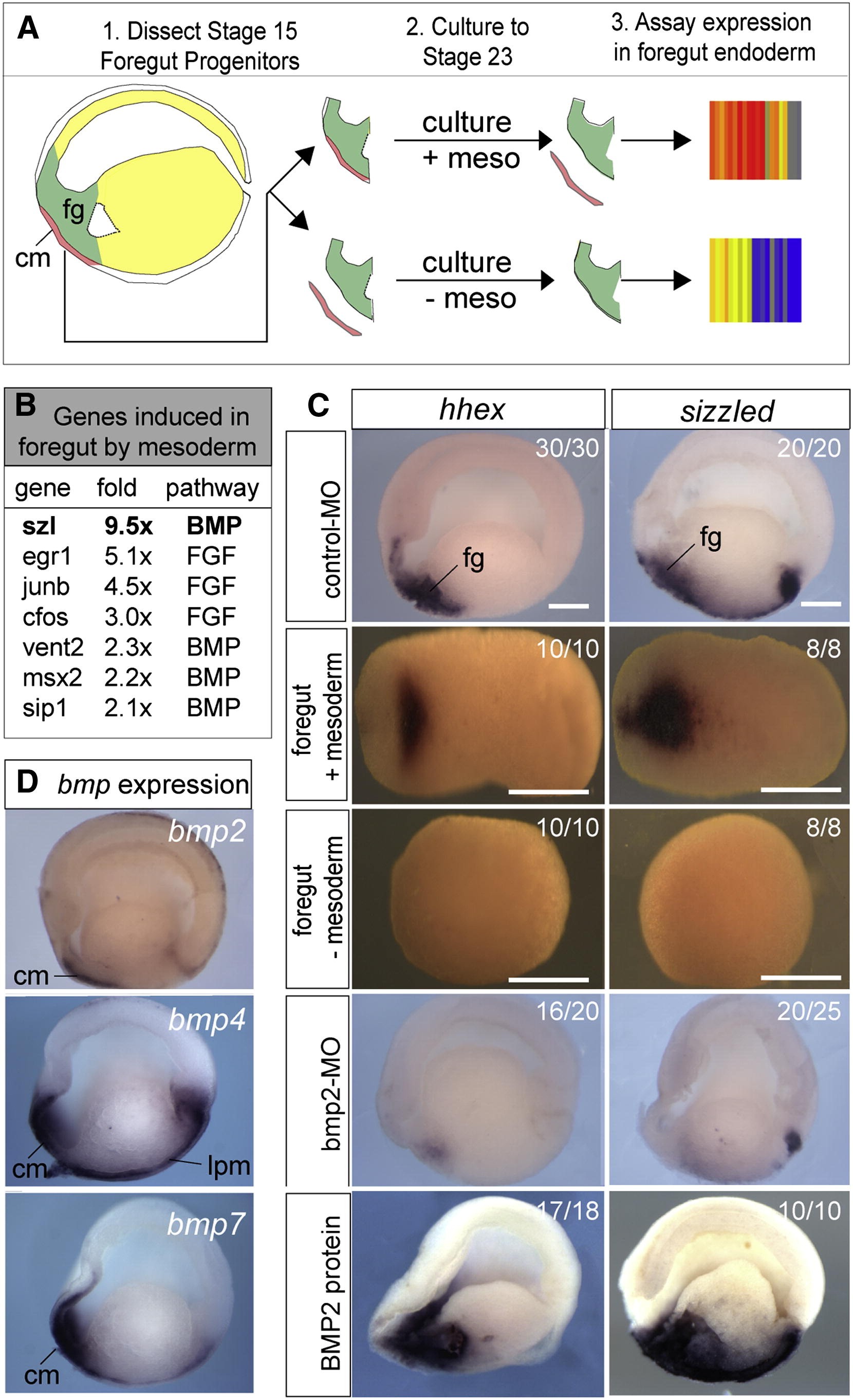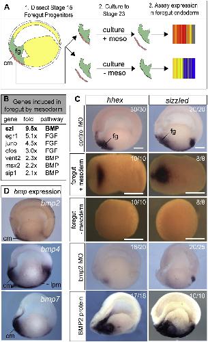 Figure 1. Mesodermal BMP2 Signals Maintain Foregut Progenitors and Induce szl(A) Strategy to identify genes induced in the foregut progenitors (fg; green) by the precardiac mesoderm (cm; red).(B) BMP and FGF pathway genes identified by microarray.(C) In situ hybridization to bisected stage 20 embryos (anterior left) and isolated ventral explants cultured from stage 15 to 23 with or without mesoderm confirms that szl and hhex expression requires mesodermal signals. Injection of cont-MO, bmp2-MO, or BMP2 protein demonstrates that szl and hhex expression are regulated by BMP signaling.(D) Bisected stage 20 embryos (anterior left) showing bmp2, bmp4, and bmp7 expression in the precardiac (cm) and the ventral lateral plate mesoderm (lpm).See also Figure S1. |