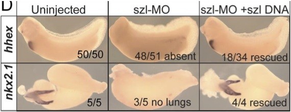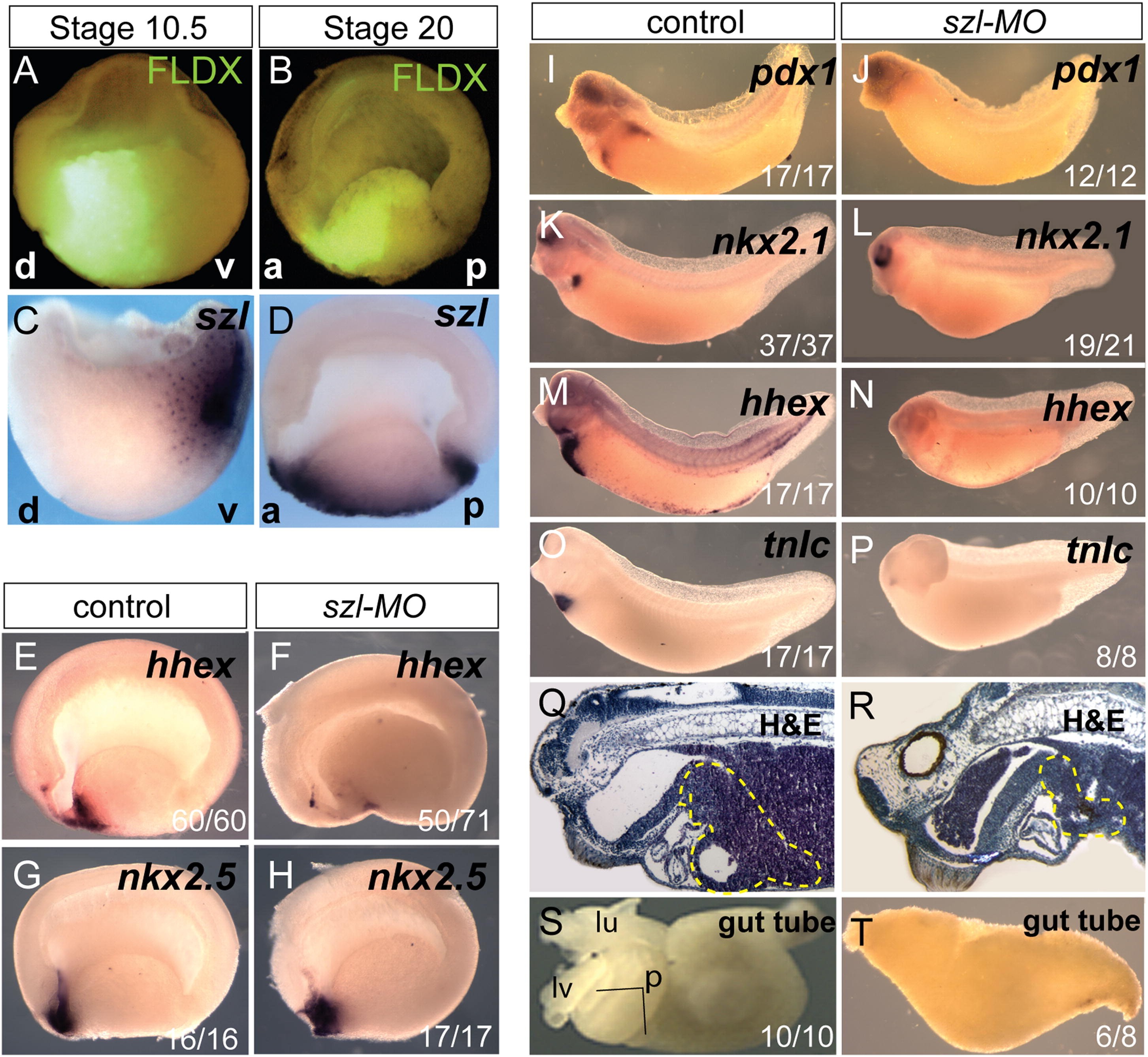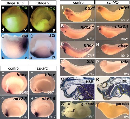 Figure S2. Targeted injection of the szl-MO into the foregut does not disrupt gastrula axial pattering. (D) Expression of hhex at stage 32 and nkx2.1 in the lung buds of stage 42 isolated gut tubes shows that embryos injected with the szl-MO (20 ng) lack foregut organs and this can be rescued by sequential injection of the szl-MO and a szl expression plasmid (500 pg). |