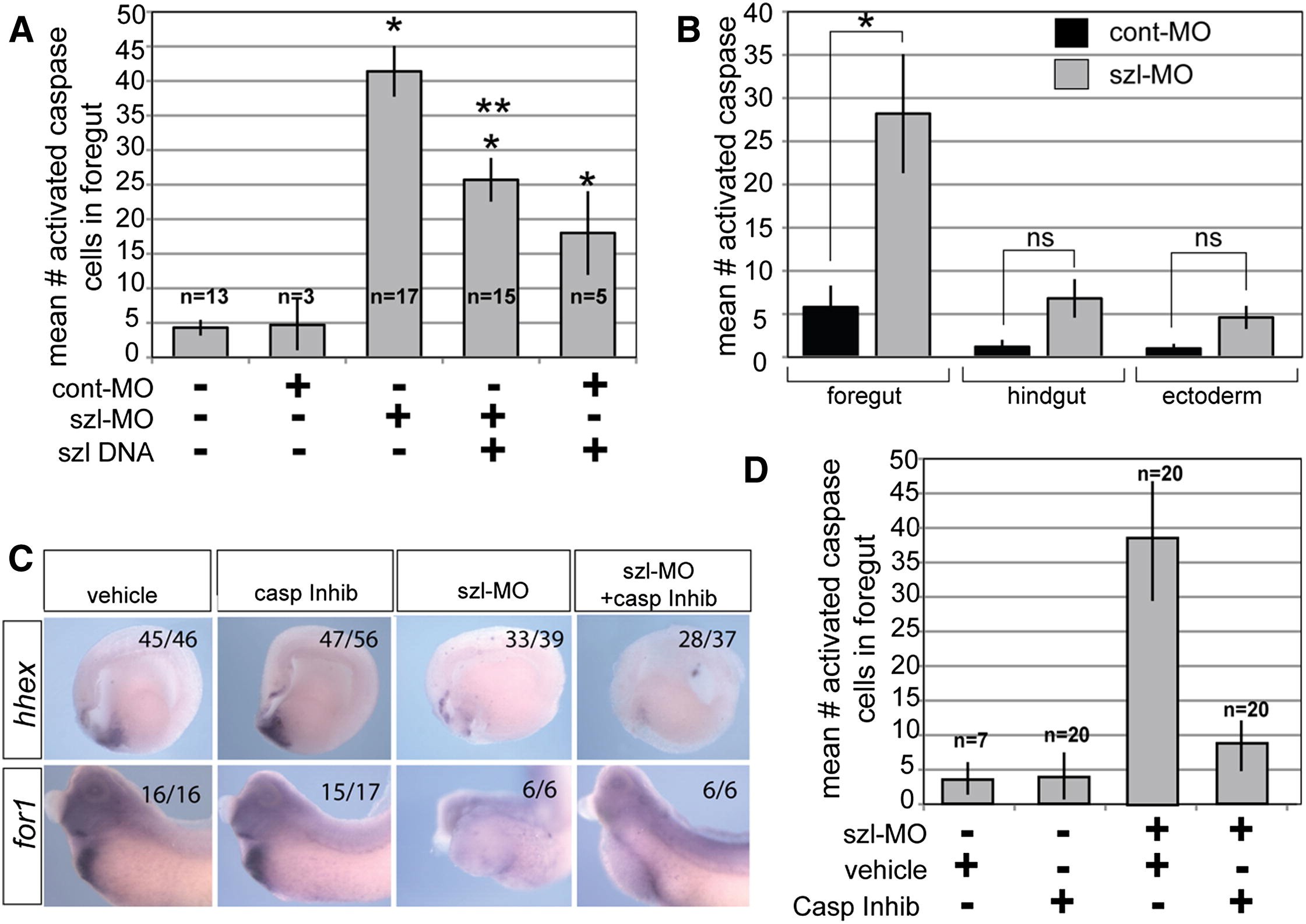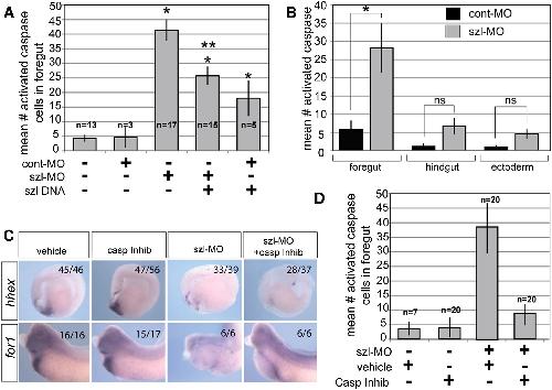 Figure 3. Szl Depletion Results in Foregut Progenitor Apoptosis(A) Szl depletion causes increased foregut cell apoptosis. Mean number of activated caspase-3 cells SEM in the foreguts of stage 20 embryos injected with cont-MO (20 ng), szl-MO (15 ng), and/or szl-DNA (500 pg) from three independent injection experiments. In Student's t tests p < 0.05 âcompared to cont-MO and ââcompared to szl-MO.(B) Apoptosis was specific to the foregut. The szl-MO (20 ng) was injected in all cells of 4-cell stage embryos and the mean number of activated caspase-3 positive cells SEM in the foregut, hindgut and ectoderm was scored from five stage 20 embryos. âp < 0.05 comparing cont-MO to szl-MO; ns, not significant.(C and D) Cell death cannot account for loss of foregut identity. szl-MO-injected embryos treated at stage 12 with one of three different caspase inhibitors (n > 10 per inhibitor). In each case, szl-MO embryos still exhibit reduced hhex and for1 (C) even when cell death was rescued (D). A representative experiment is shown.Error bars reflect SEM. |