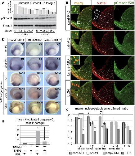 Figure 5. Szl Is Required to Maintain Robust BMP Signaling in the Foregut(A) Western blot of pSmad1/5/8 and total Smad1 in foregut explants from cont-MO and szl-MO embryos at different stages shows reduced BMP signaling in Szl morphants.(B) Szl-depleted embryos exhibit reduced pSmad1 signaling in the foregut. Fifty micrometer confocal Z-projections of pSmad1/5/8 (green) and nuclei (red) in stage 20 sibling embryos injected with cont-MO (20 ng), szl-MO (15 ng), or bmp2-MO (20 ng) or treated with BMP-receptor inhibitor LDN193189 (40 μM). Yellow dashed lines indicate the mesoderm-endoderm boundary. Dashed white lines in nuclear channel of the cont-MO illustrate the subregion of the foregut, based on number of nuclei from the mesoderm. See also Figure S3.(C) Szl- and Bmp2-depleted embryos have reduced pSmad1 levels in the deep foregut endoderm. Mean nuclear/cytoplasmic ratio of pSmad1 immunostaining intensity SEM in foregut cells at different distances from the mesoderm, quantitated from 80 μm Z-projections from four sibling embryos/condition. âSignificantly different from szl-MO, p < 0.05.(D) Expression of bmp2, bmp4/7, and BMP-target genes szl, vent1/2, and hhex were downregulated by injection of the szl-MO (15 ng) and rescued by subsequent injection of recombinant BMP2 protein (4 ng) into the foregut at stage 12.(E) Mean number of activated caspase-3 positive foregut cells SEM (n = 5 embryos / condition), âp < 0.01 in Student t tests.Error bars reflect SEM. |